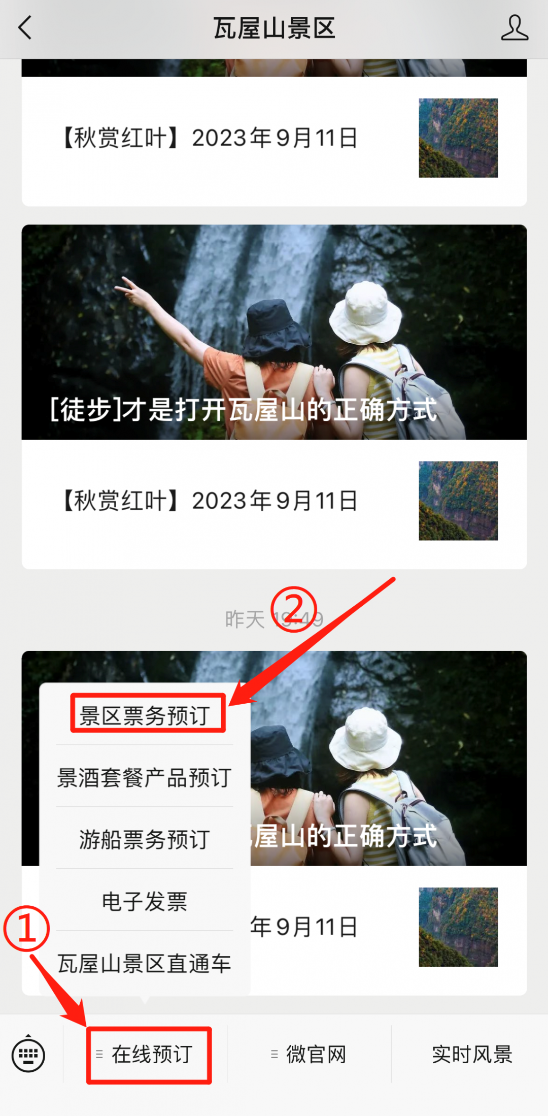 1.微信关注“瓦屋山景区”或“瓦屋山国际旅行网”