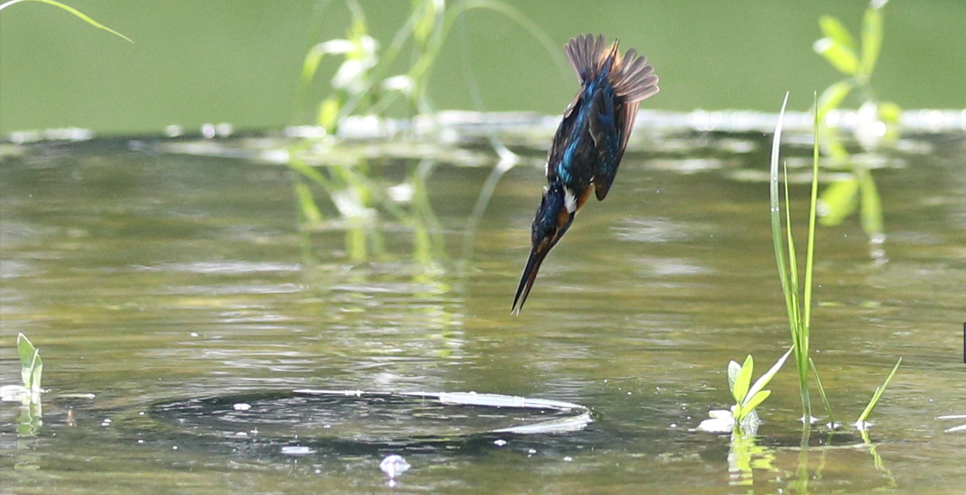 外面目标区,在一片水塘边上,建了一个圆形水池,处罩迷彩布,泥沙铺底。一些水草,星星点点的摆放其间,水大约15公分深,中间有一个小水盆,盆沿跟水面平,小鱼放在盆里,还能给小盆送氧气以保持鱼的活力。引小翠来吃。在水池一端放了一根枯木桩,供小翠在上面停留,也便于小翠居高临下观察,伺机而动。水池中装鱼的小盆,从大棚内看出去,拍摄角度刚好。水的深浅也是仔细考虑的,水太深了,捕捉难度大,成功率低。太浅的话,小翠的长喙有可能撞到池底而受伤。这样的设计既方便了小翠捕食,客观上也为鸟友降低了拍摄难度。