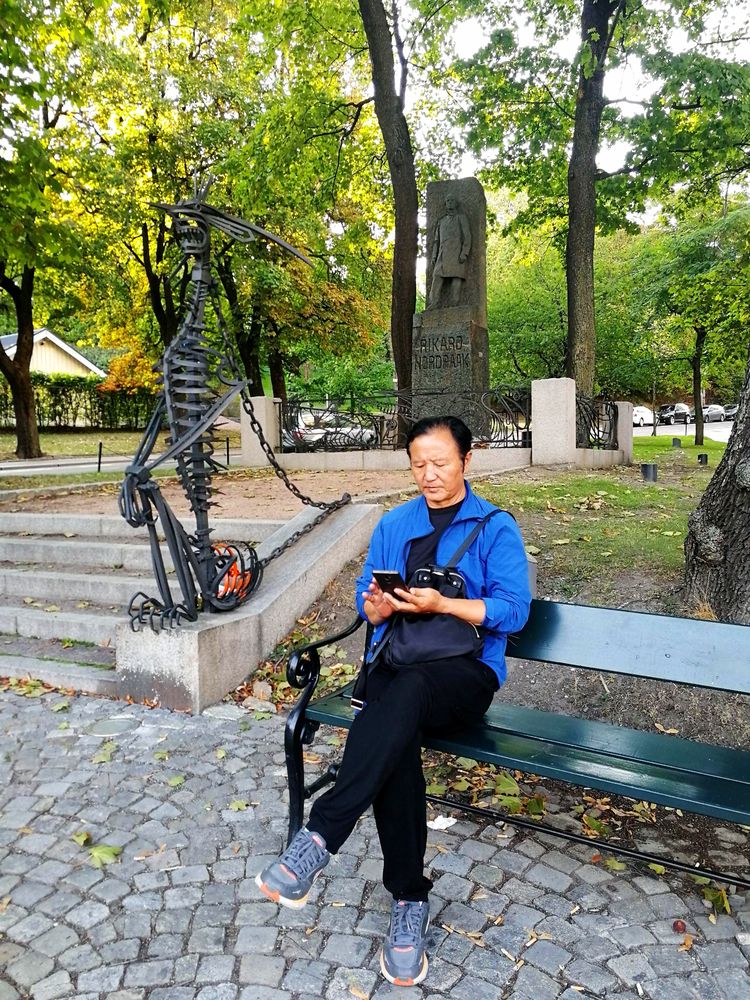 斯德哥尔摩的早晨,刚下过一阵雨,雨后天渐渐转晴,太阳从云缝中射出光芒,在上旅游大巴前,抓紧时间给耀金拍张照片,以作留念。