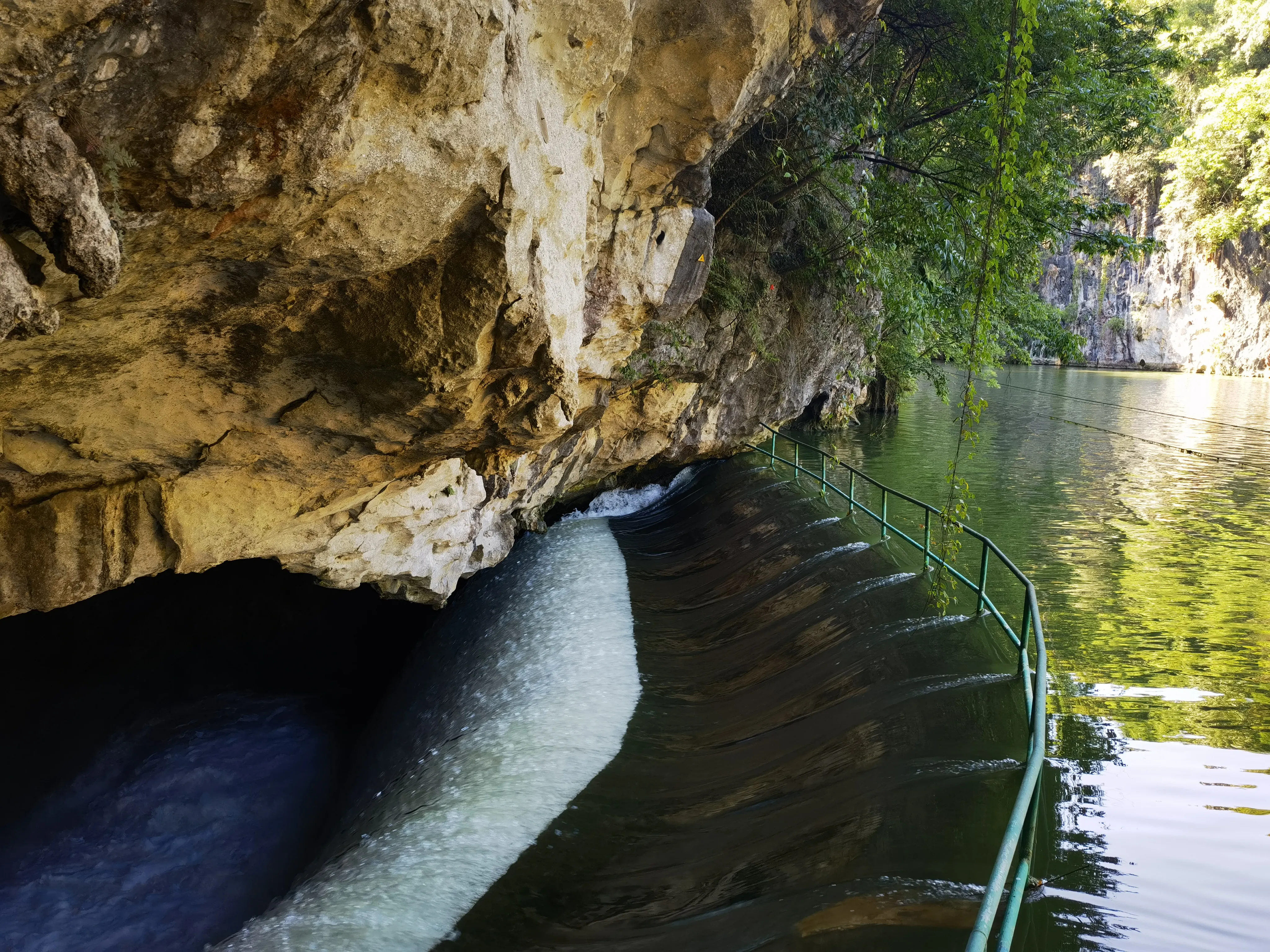 转过来,刚才那个流入的洞口上方是一片平静的湖。湖水流进洞穴,形成了“龙门飞瀑”的奇景。
