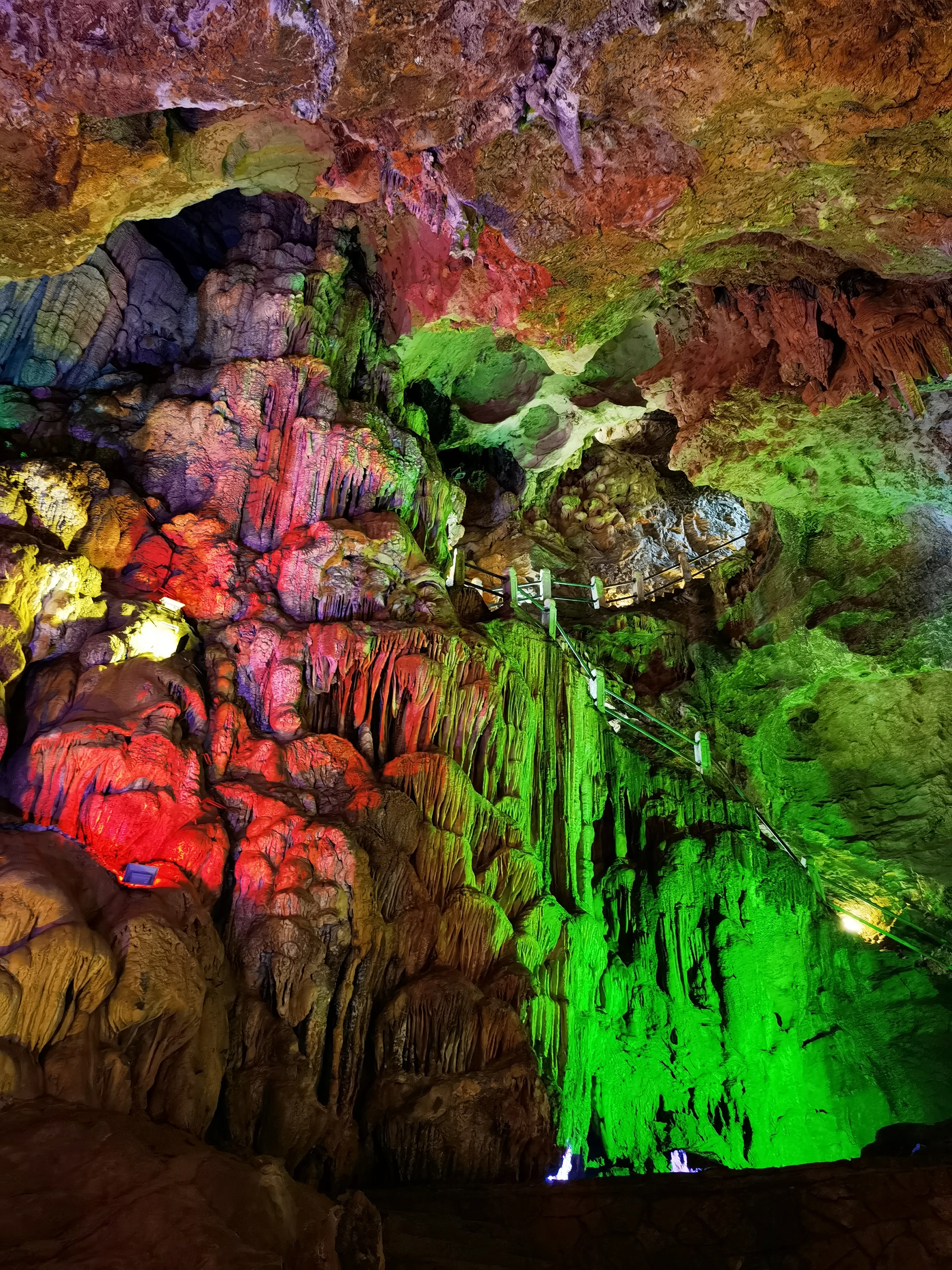 继续往前走,看见虎穴洞。虎穴洞的洞口是人工凿出来的,在半山腰上,属于旱溶洞。虎穴洞洞长400米,里面与形态各异变化多端的石钟乳、石笋和石幔等。有的像一层层堆砌起来的蘑菇,有的似珠帘由洞顶一直垂到洞底。
