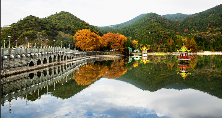 5. 芦林湖,位于庐山区海拔1040米的东谷芦林盆地,故又称芦林湖。从黄龙寺沿石阶曲径上行约20分钟,便到芦林大桥。一路密林蔽日,树干高耸挺拔,夏日人行其间颇感凉爽。芦林大桥高30米,桥坝一体,拦水成湖,湖水如镜,似发光的碧玉镶嵌在林荫秀谷之中,在缥缈的云烟衬托下美丽。