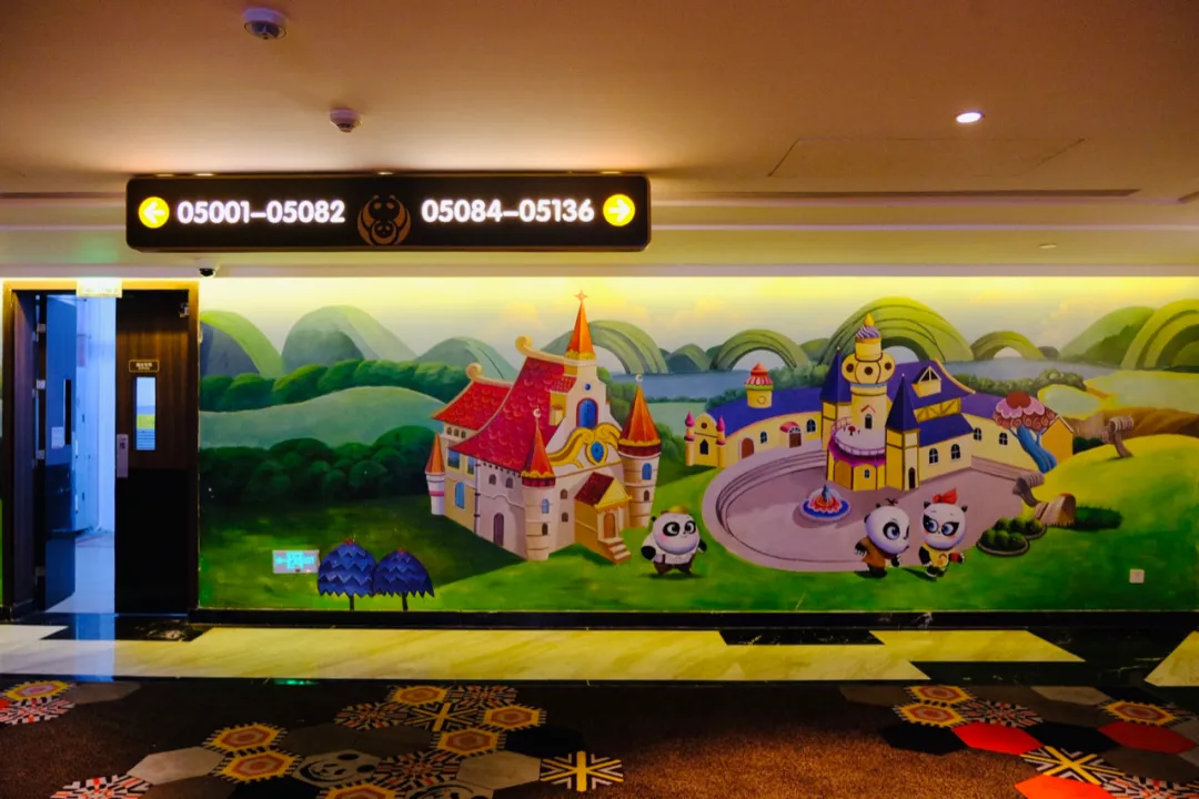 熊猫酒店主打亲子,到处充满着色彩和卡通元素,而且在大堂就可以看到孔雀,听说看到它们开屏就会有好运噢。