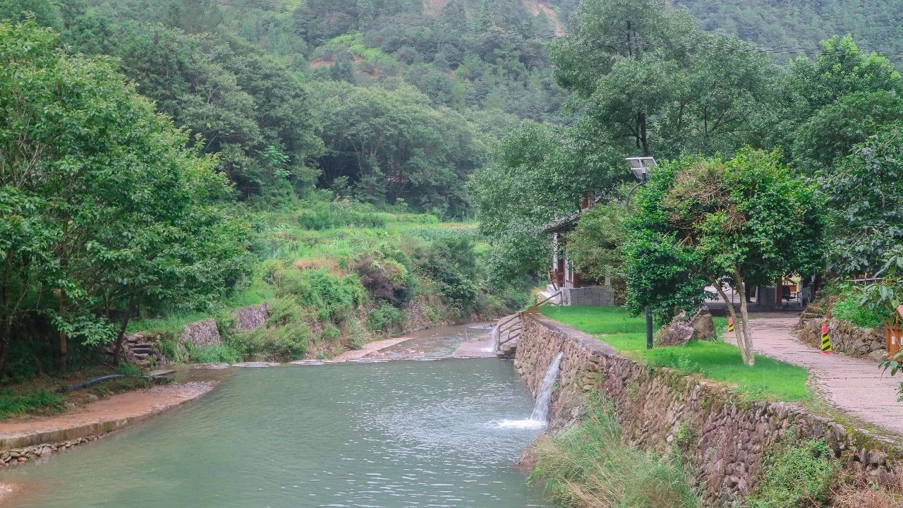 从大门进入便可见一条河溪,里面的水特别绿特别清澈,右边是一片树林,中间是一条石板路,因为有了林荫的庇护,走在石板路上十分清凉~