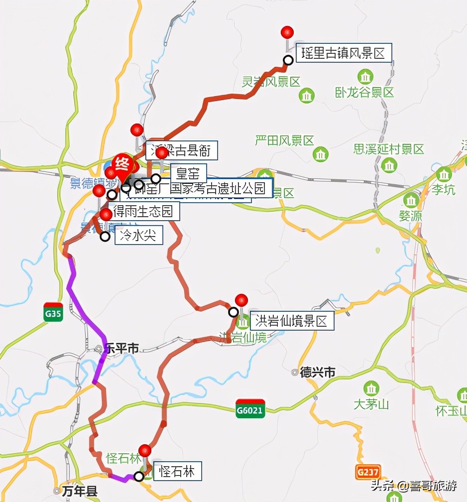 2、江西景德镇十大景点自驾游行程路线:江西景德镇-御窑厂国家考古遗址公园-浮梁古县衙-瑶里古镇风景区-景德镇陶溪川创意广场-皇窑-洪岩仙境景区-怪石林-冷水尖-得雨生态园-景德镇古窑民俗博览区-江西景德镇。
