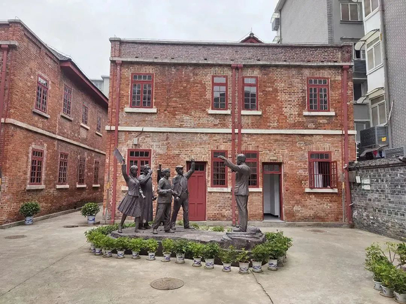在中共中央东南分局旧址的中心位置,一组革命主题的雕塑群在阳光的照耀下熠熠生辉,仿若一个未被时光打扰的历史空间。西式红砖房、雅致的门窗、两侧对称的楼梯,让人仿佛回到了那个年代。