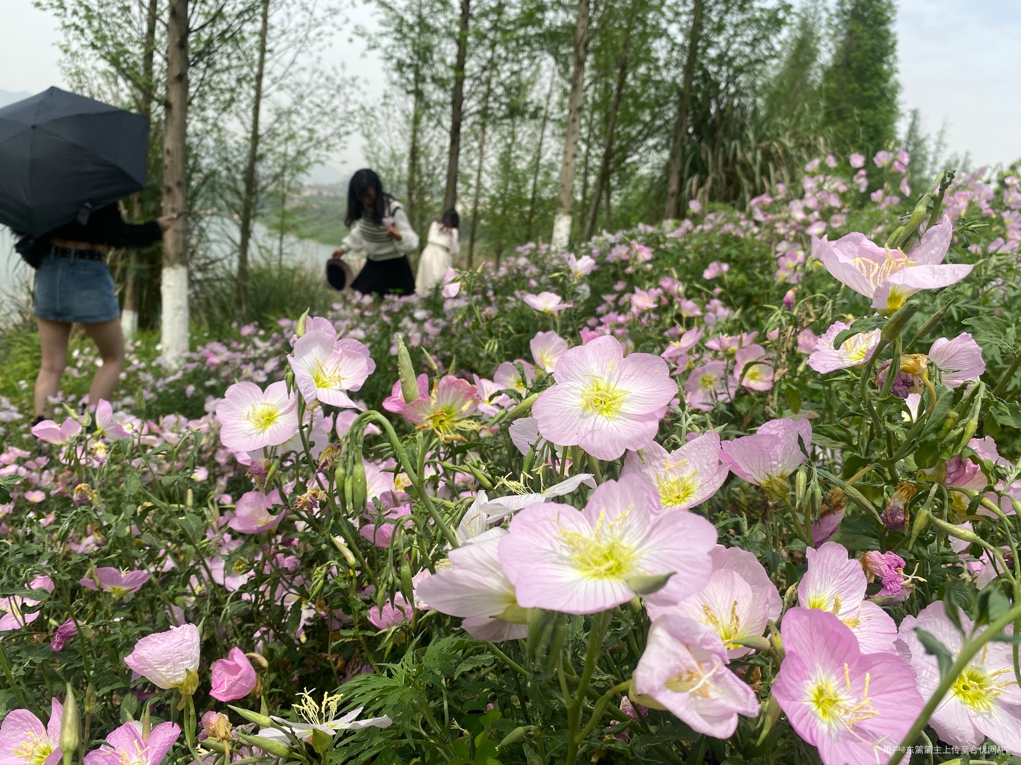 我们此次出行主要是观赏月见草绽放出的美丽花朵。果然,健身步道两旁开满了月见草花朵,大朵大朵的在阳光下妩媚,在春风中舞蹈。有白色的,粉色的,有白中透粉,粉中透白的,十分美艳动人。