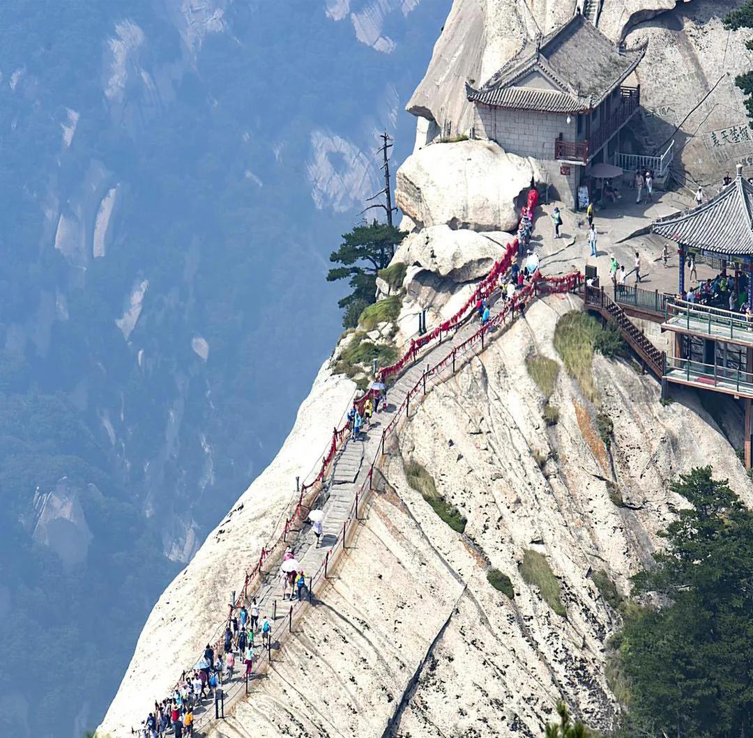 脚下是不超过30厘米的木板,二尺小路背靠深渊,悬空横挂没有护栏,这个让人看一眼都腿软的惊世奇观,就是被誉为“华山第一天险”的长空栈道。