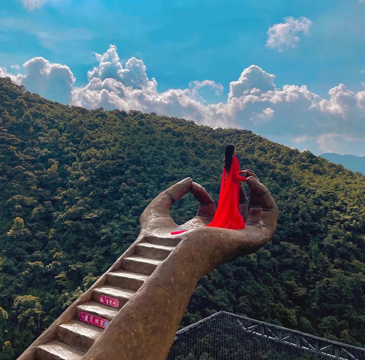 悬崖边伸出的一只巨手,没有任何防护栏,站在上面就是“掌上明珠”,掉下去就是“新闻头条”。沿着台阶往上行走,君临天下的感觉油然而生,站在佛手上俯瞰古龙峡的绿水青山,令人心旷神怡。