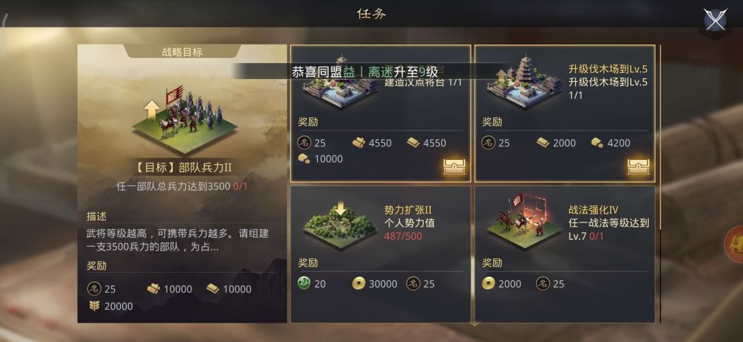 3、以打第一个3为节点,这时候差不多4本的资源也有了(领扩建任务奖励);为了最快的打满3(时间就是金钱,当然如果周围没有人跟你抢的话节奏可以稍微慢点),秒4本,4级5级募兵所,1级统帅厅(共80玉);带上系统送的刘虞,这时候大概兵力能有2000左右,刷3会稍微轻松一点;刷到体力用光,征兵,征兵结束继续打如此反复;直到24小时内把3打满为止;