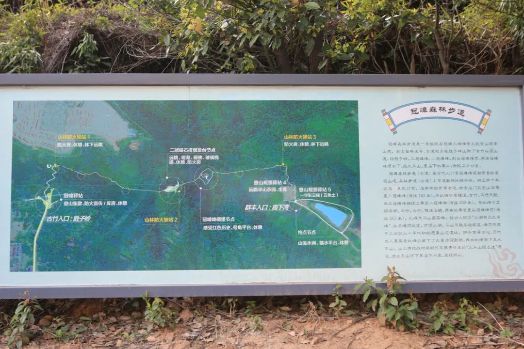 入口有冠嶂森林步道的介绍。冠嶂森林步道起于胜子岭脚下,经胜子岭、三冠嶂峰、二冠嶂峰到头冠嶂峰顶,再南下经大东山,至庙下水库止,全长2.5公里。
