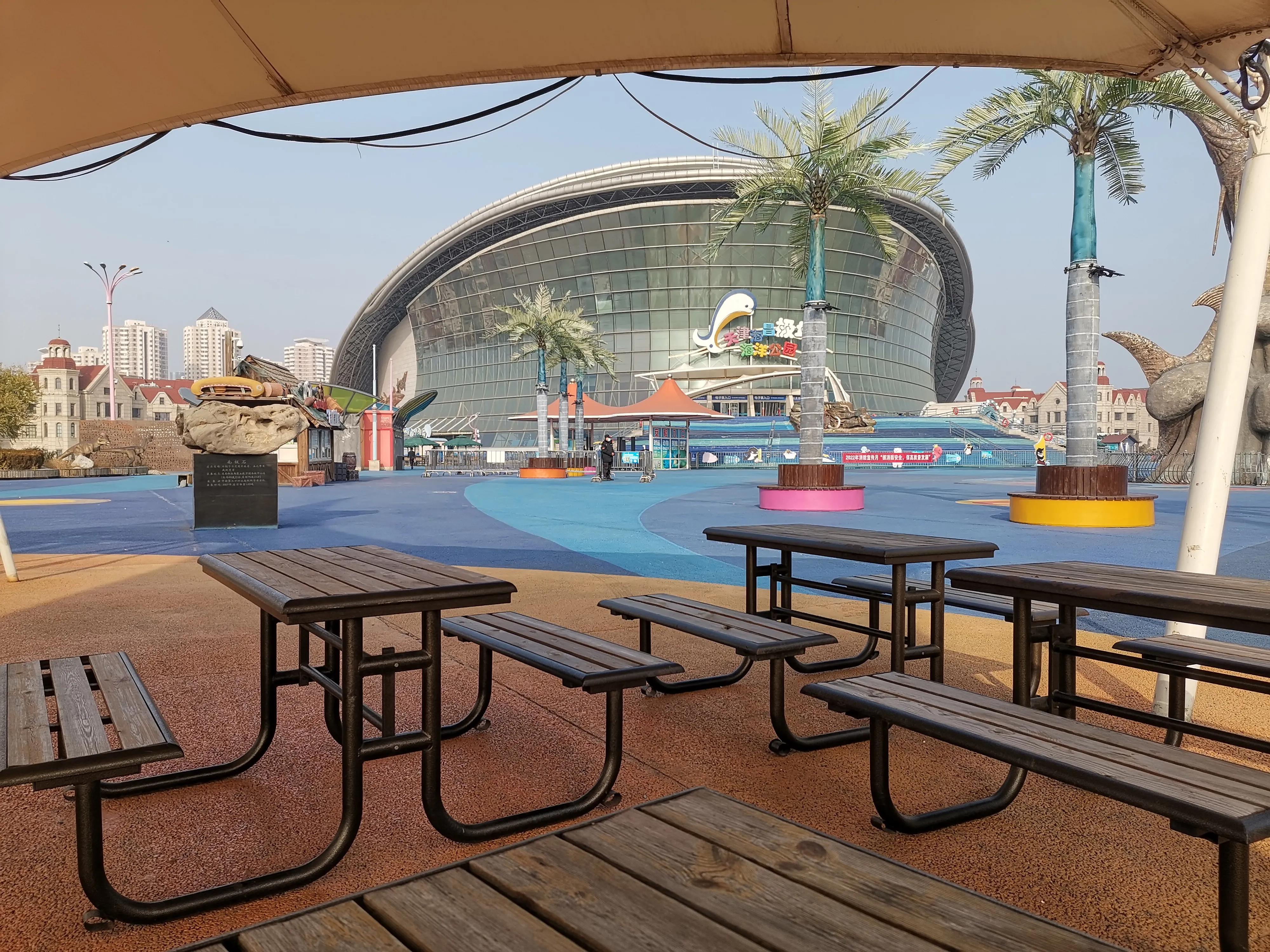 今天是阴天,来到天津塘沽外滩河畔,欣赏下这个巨大的海昌极地海洋公园。不过令人遗憾的是,公园里没有多少人。可能是工作日,也可能是因为疫情,来这里观赏的人很少很少。但是在外面也能感受到这个海昌极地海洋公园的宏伟气势,占地面积50000平方米,最高处的建筑高度达到67。展馆里有白鲸、海豚、北极熊、企鹅、北极狐、北极狼、海象、海狮等很全的极地海洋生物品种。