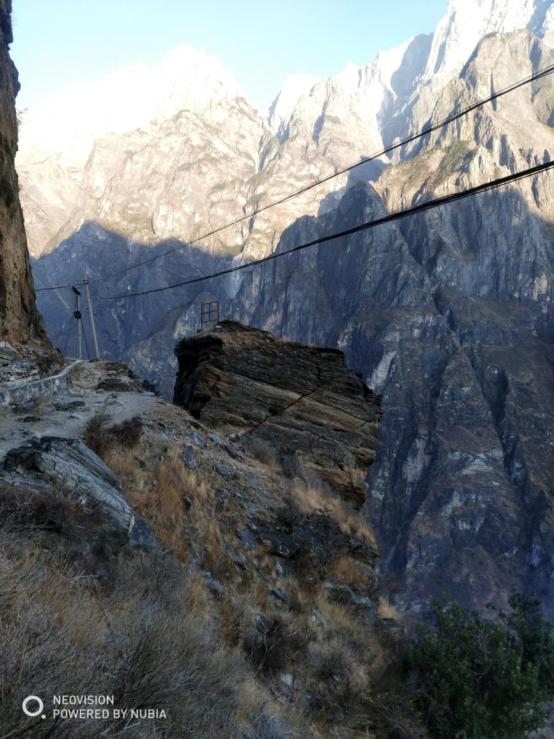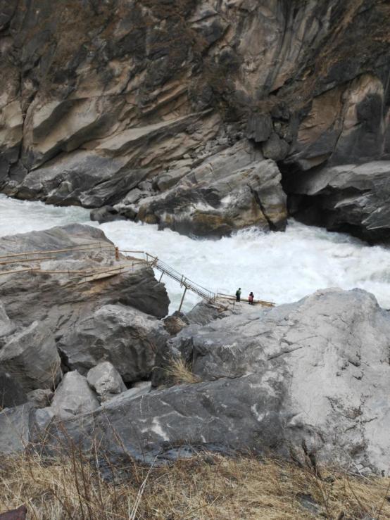 ↑↑ 11点半才到达上虎跳,中间到桥头镇买虎跳峡景区门票,45元一张,上虎跳是成熟的景区,游客不算多,从停车场到虎跳石观景平台大约15分钟,都是木台阶,身体不好的可能会慢一些,下了台阶就到上虎跳观景台,这个季节属于枯水期,水量不大,但是道观景台看还是比较震撼的,水是清水,白色的浪花还是很漂亮。不知道什么原因,丽江那一侧上虎跳观景台没有开放,只有香格里拉测的观景台开放。12:20上虎跳景区出发步行到徒步入口,12:50到达徒步路口。
