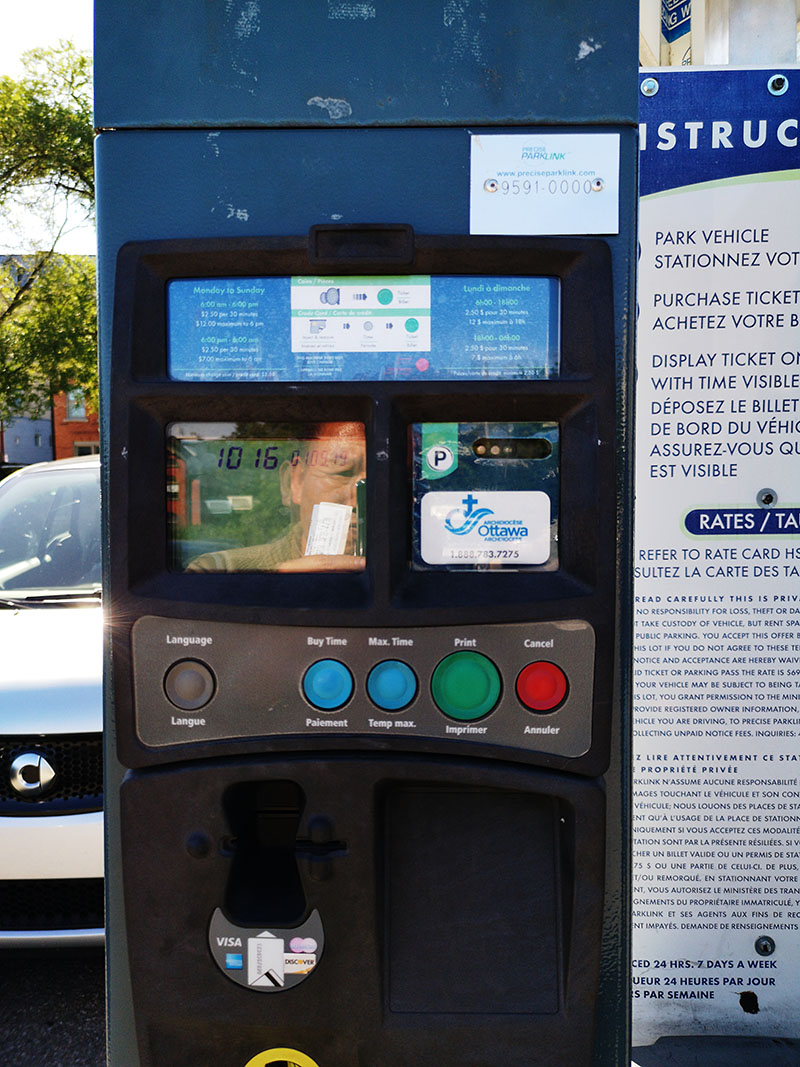 无人购票机,自觉购买停车费,1小时$5,放在车仪表盘上方,在车外能看到。