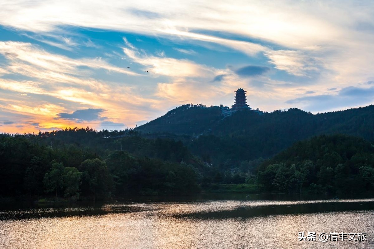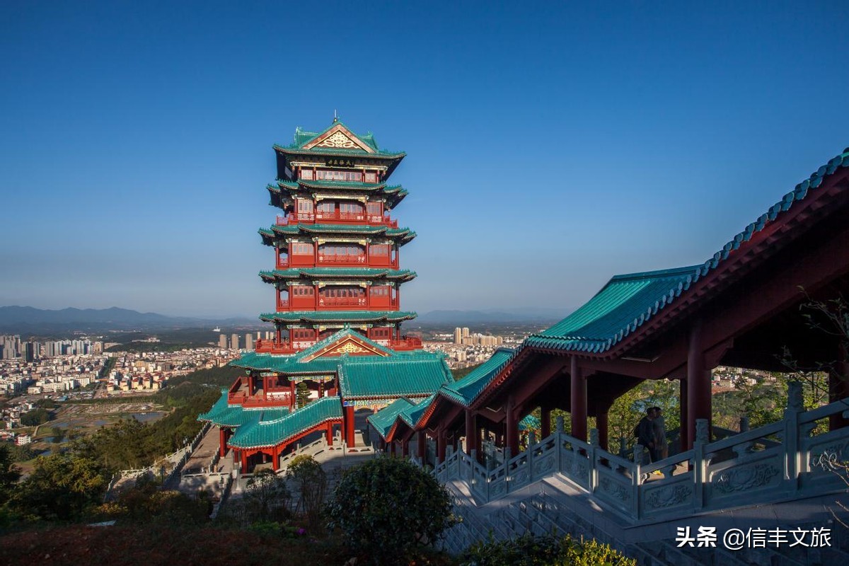 沿着弯弯曲曲的山路登高俯瞰,信丰阁像一颗遗落人间的明珠,熠熠生辉,亭台楼阁,环山抱水的谷山景区,人们或三五成群散步聊天,悠闲自得,或应着时节,出来踏青锻炼,好不快乐。