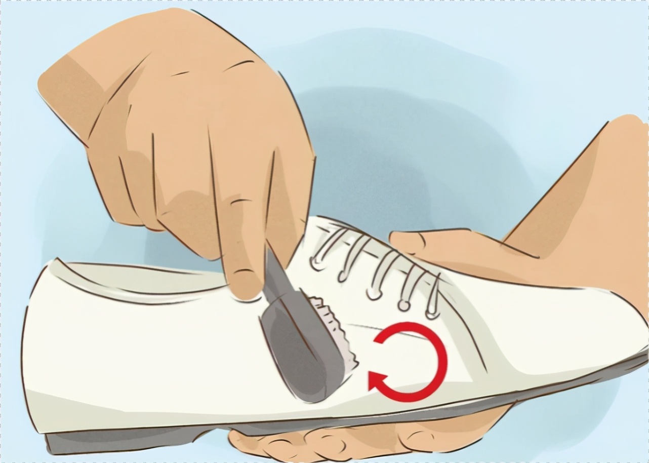 用硬毛牙刷擦洗污渍。将牙刷的头浸入水中,使刷毛湿润。以较小的圆周运动方式在鞋表面上刷毛,着重于沾染严重的区域,用少量压力将清洁溶液打入鞋子的织物内。