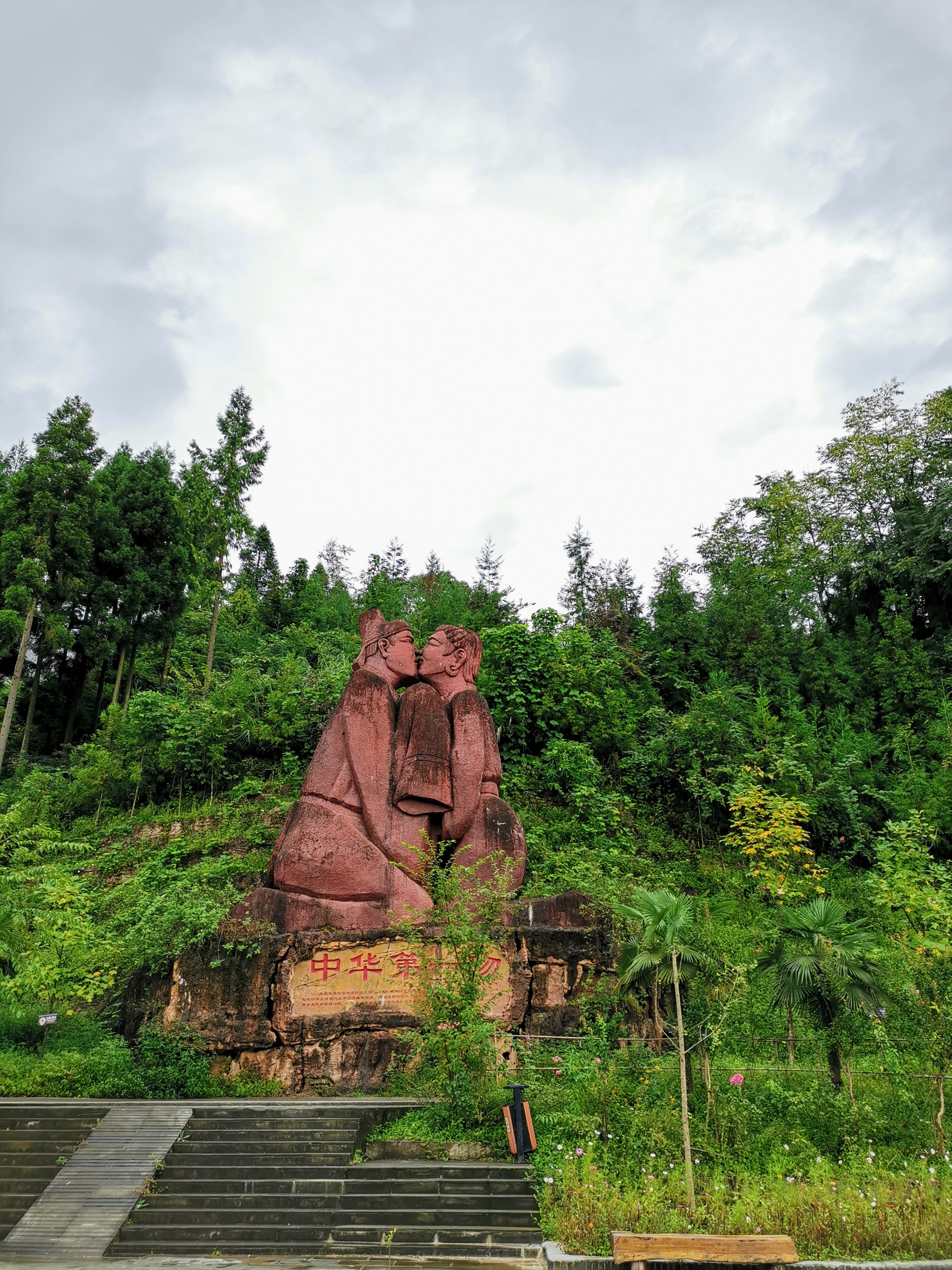 还有中华第一吻的雕像,据说是根据古墓出土的画像砖上的接吻画面还原。旁边是司马相如和卓文君的塑像。