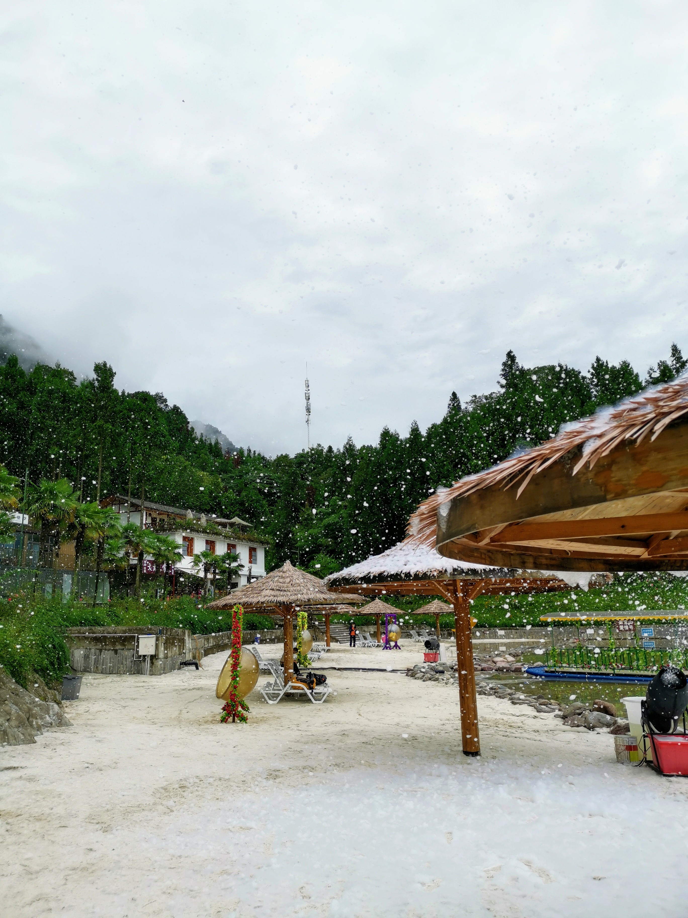 再走一段,很神奇的风景一变,水池边有个白沙滩,摆了沙滩椅和阳伞,弄得跟海边一样,而且还有……起泡泡机!!!这个真是绝了,虽然有点不伦不类,但是不得不说真是拍照凹造型的好背景。这景区真的是不断给人惊喜。