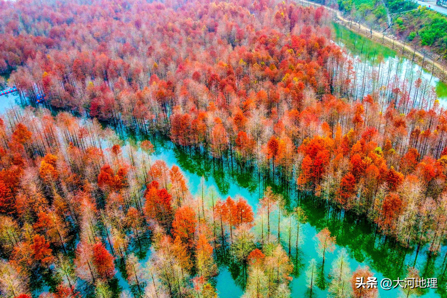 到了深秋,落雨杉渐渐变红,浅红、深红、金黄,层层叠叠,五彩缤纷,在眼前清澈水面中的倒影,与远处巍峨山峦的呼应下,一幅艳丽厚重的油画便油然而生。最佳观赏期是11月中旬-12月中旬。