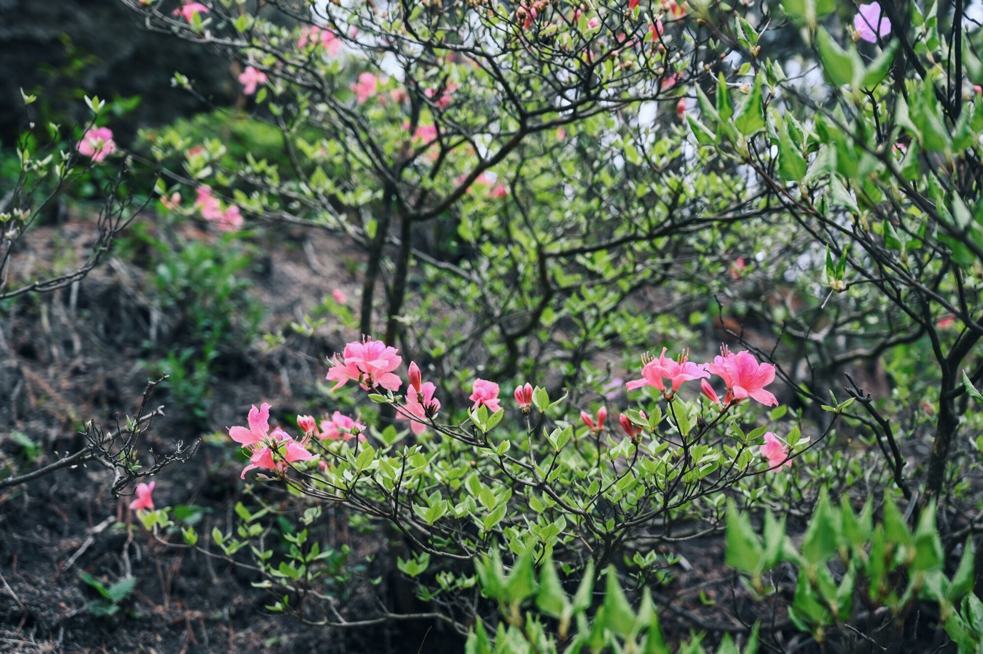 另外,在去往山顶的途中,山间的野生杜鹃花此时已是盛放期,一朵朵或红色、或白色、或粉色、或黄色的杜鹃花掩映于群山绿树之中,把这座山点缀的更为秀美。