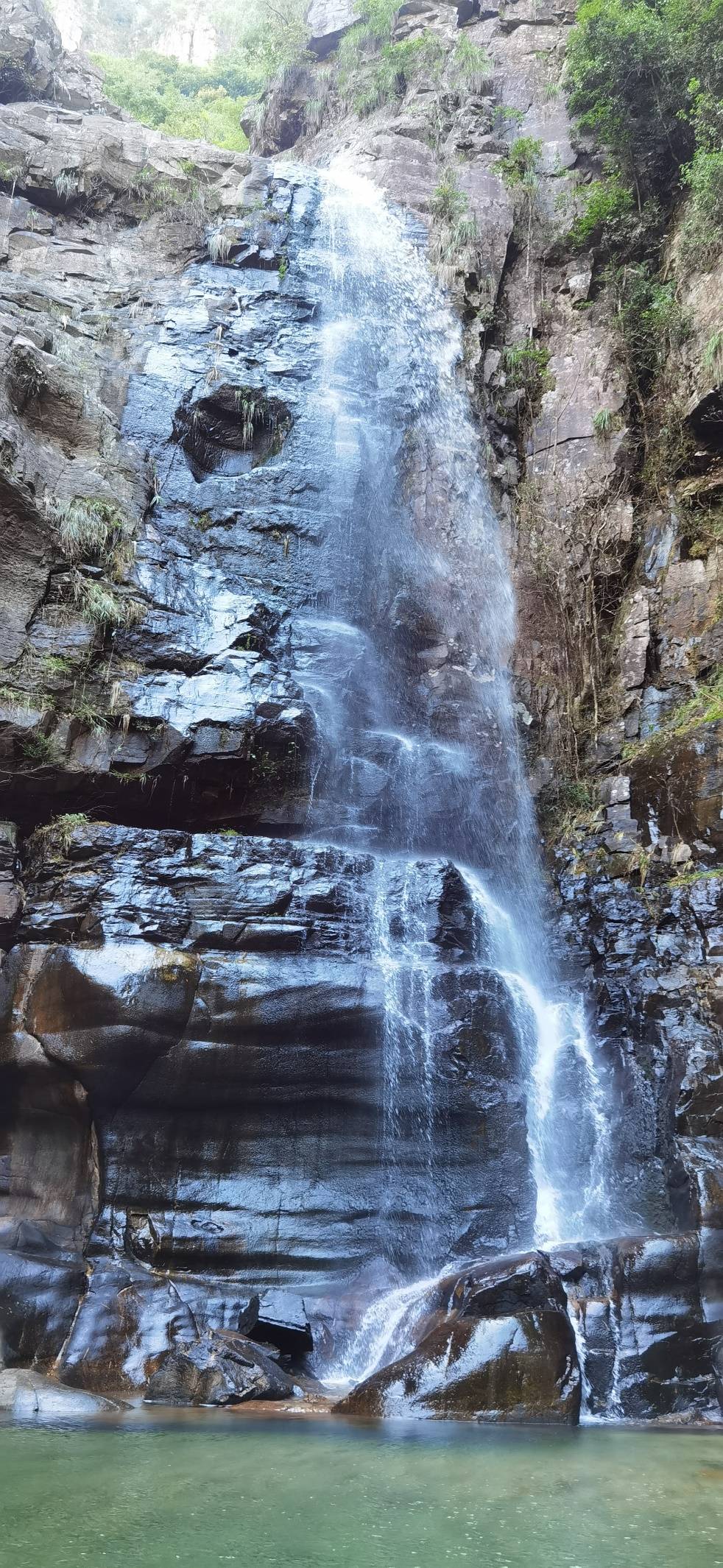 在谷口可以看到大峡谷的全貌。谷口边缘植被的自然分割线很清楚地展示了地形坍塌的痕迹。这里海拔630米,应该是原来的山顶。因为往远方看去,对面山顶的风车在我们视线的下方,有些风车还没有完全露出头来。有一片风车很像天线宝宝出场时的那片山坡。可以向下俯视大峡谷最大的瀑布腾龙瀑布,据说落差超过两百米。瀑布可能是这条路线的主要看点。一路各种大小的瀑布,如果是丰水期可能会更壮观,谷底河谷的流水冲击痕迹显示出水流最高能比目前高出好几米。谷底每个瀑布都有冲击出来的水潭,有几个位置设置了亲水平台,可以带孩子摸摸水扔石头玩。潭水清澈冰凉,我装了一大瓶,口感清甜。有游客忍不住扑进去游泳了。