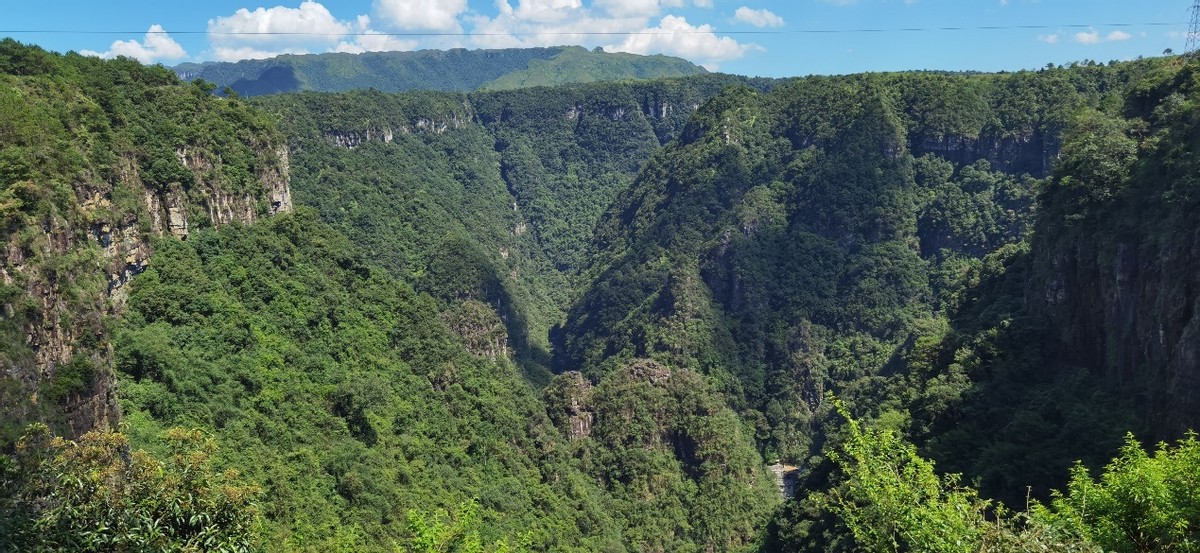 接近下午三点钟进到大峡谷。我理解的大峡谷是狭长的类似于河沟蜿蜒前行的带状的地段,而眼前的大峡谷我觉得更像一个盆地,因为从地貌可以看得出来,应该是中间的地面坍塌形成了一个近乎圆形直径可能有几百米的凹陷。游玩路线大概就是下到谷底转一圈再上到原点,基本就是一个立体的环形。我们选择了一条用时大概四小时的路线。谷口广场→生态观景步道→一线天景区→水卷寨景区→谷底游客服务点→黄龙潭→腾龙潭→发电展览室→南门游客服务区→谷口广场。路程约4公里,从谷口下到谷底落差300米左右。