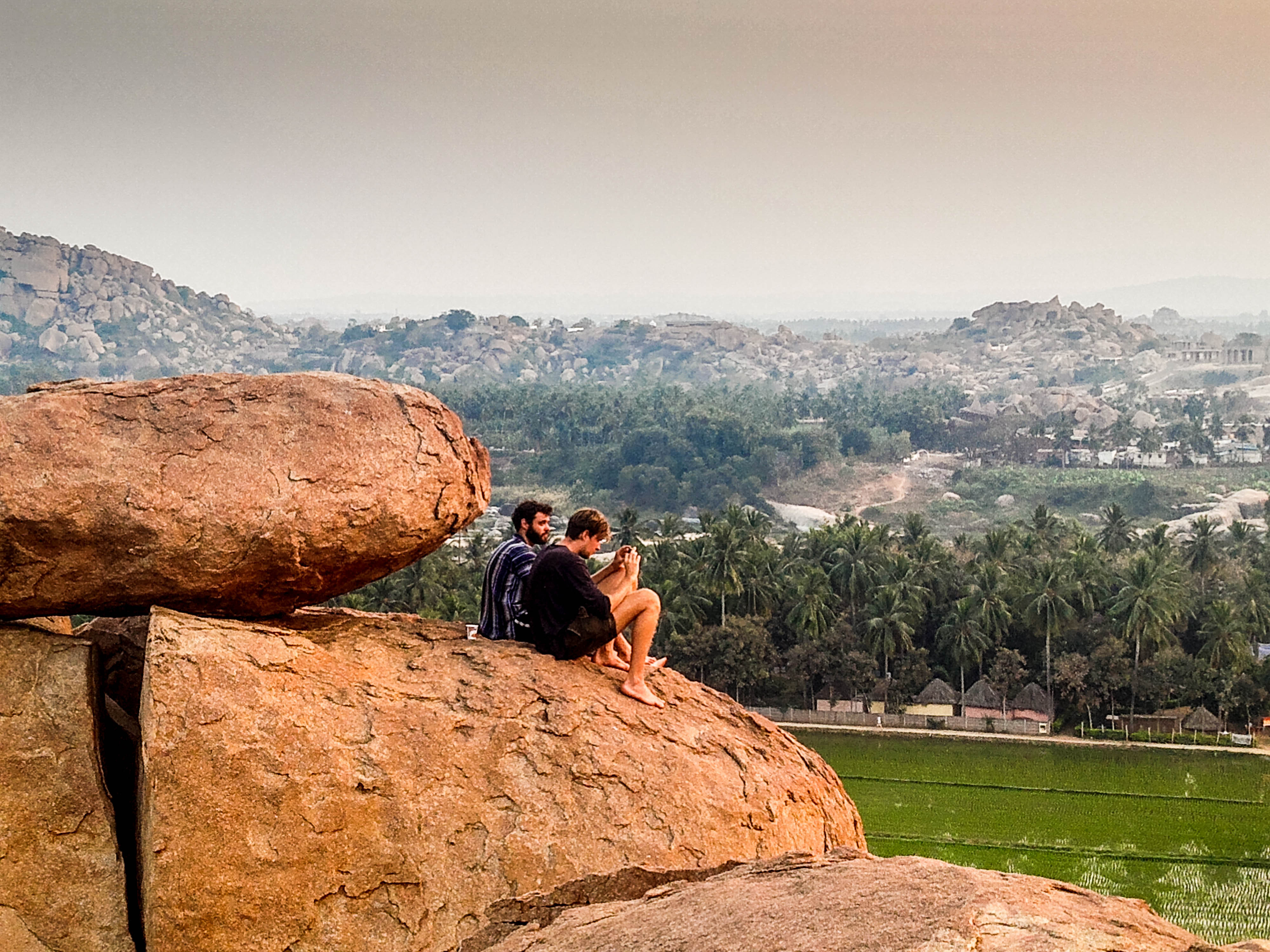 爬山“石头山”,是亨比最佳的观赏日落的地方,每天都有来自世界各地的游客。每当这时,当地的小孩们就会提着茶壶来到石头山,向游客们兜售印度奶茶chai。