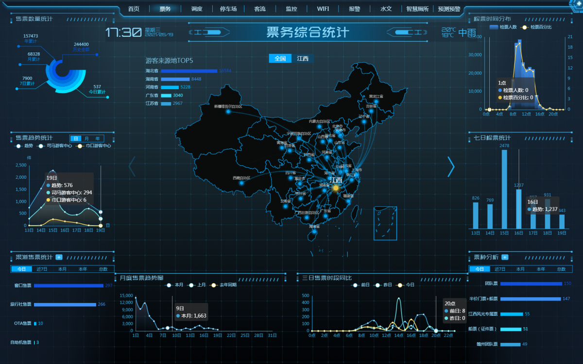综合管理平台集景区安防监控、一键报警、景区大数据、AI机器人、应急指挥调度、水位监测、无线WiFi、电子票务、客流统计等功能于一体,实现对景区数据和日常运行监测和管理。