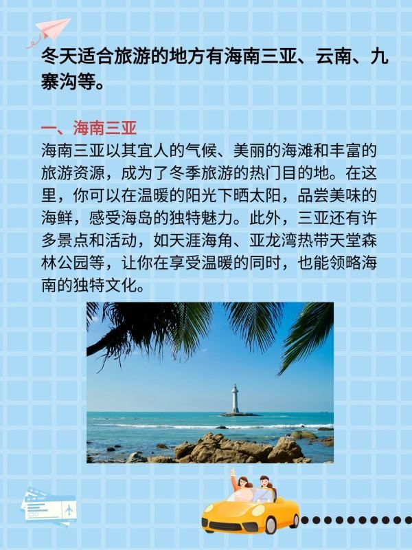 冬天适合旅游的地方有海南三亚、云南、九寨沟等。