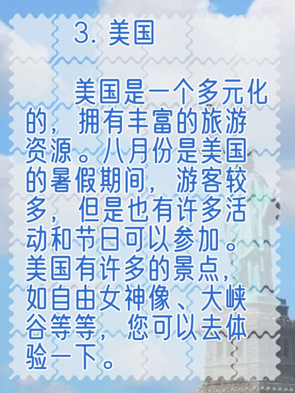 美国是一个多元化的,拥有丰富的旅游资源。八月份是美国的暑假期间,游客较多,但是也有许多活动和节日可以参加。美国有许多的景点,如自由女神像、大峡谷等等,您可以去体验一下。