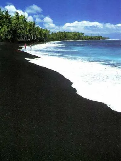 黑色的细沙是由于海洋特定环境形成的黑色次生矿海绿石所致。海绿石受海流影响,被搬运至近岸,再经风浪携带到海滩,使原来洁白明净的白沙滩,变成与众不同的黑沙滩!