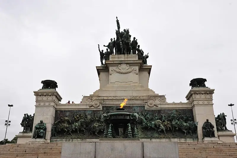 在博物馆的正前方,我们所看到的独立广场和纪念碑,是在1922年,为纪念独立100周年而建成的。碑上的人物和铜像是纪念为巴西独立作出贡献的佩德罗一世和著名人士。纪念碑地下室存放着佩德罗国王和王后的灵柩。纪念碑的圣火终年不熄,与迎风飘扬的巴西国旗遥相呼应。