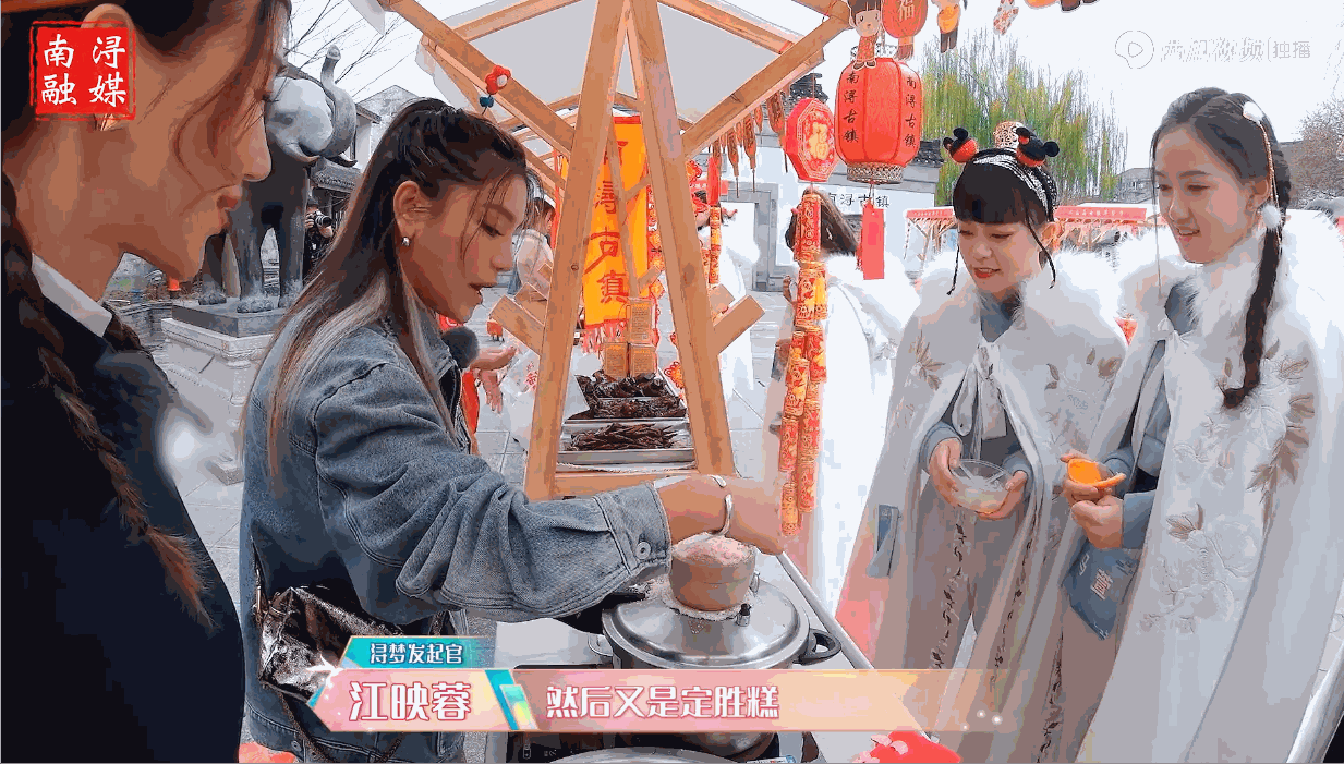 节目中导师江映蓉亲手制作一个粉色糕点,它就是定胜糕。相传此糕点为南宋百姓为韩世忠的军队出征特制,糕上有“定胜”两字,意为此番出行定能胜利凯旋。定胜糕造型像粉红元宝,看起来喜气洋洋,拿在手里沉甸甸,像一块漂亮的艺术品。
