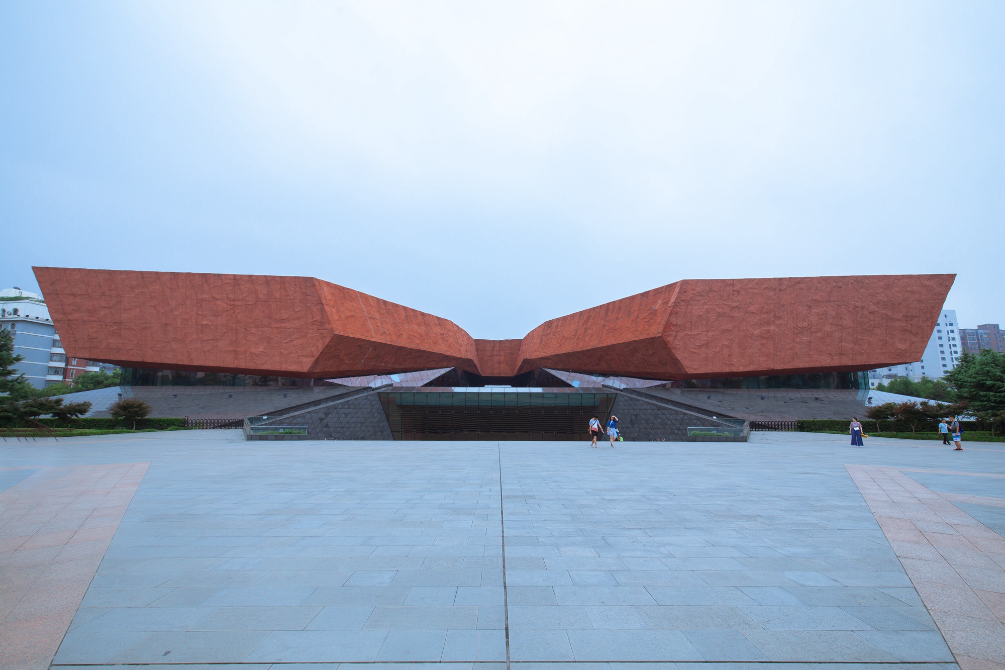 有一个巨型V字的红色建筑,是武汉为纪念辛亥革命武昌首义100周年,而兴建的一座专题博物馆,融合中国传统建筑元素和现代建筑特色,高台大屋顶的架构,双坡屋顶、飞檐翘角,几何形外观和“楚国红”,寓意敢为人先的首义精神,俯瞰呈V字造型,寓意胜利和武汉的腾飞