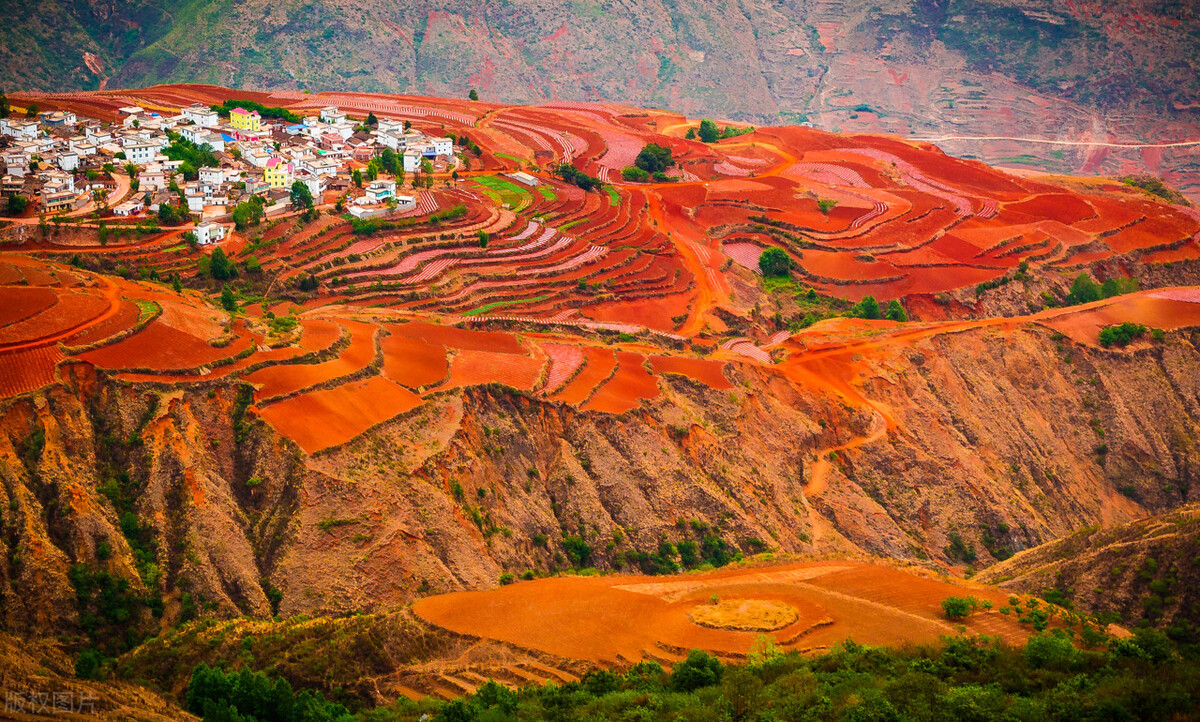 惊艳绝美的东川红土地,是云贵高原上一抹亮丽的红色,辽阔壮美中又多了一份柔情。远远望去,土地被田地和种植的农作物分割成大小不一的色块,在蓝天白云的映衬下,五彩斑斓,犹如上帝打翻了的调色盘,十分壮观!