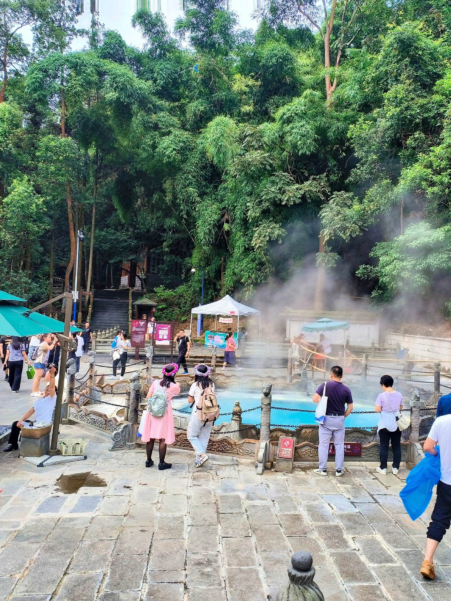 推荐在景区门口买一串鸡蛋,然后到大滚锅这里就可以免费帮你煮开,大约等20分钟就能够吃了。大滚锅旁边也有现成煮好的鸡蛋卖,也可以用温泉水泡脚。