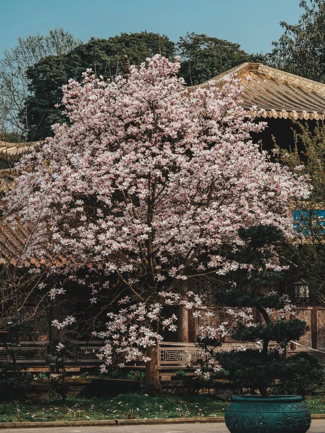 古色古香的寺院和粉白相间的玉兰花有种让人瞬间静下来的灵气,仿佛间像是穿越到了千年之前,处处透露出古韵气质,想必穿上汉服到此拍照也是绝美!