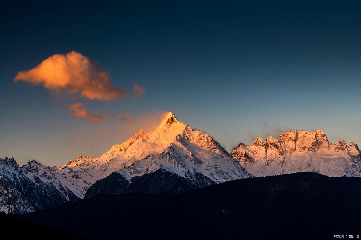 梅里雪山是藏民心中的神山,在藏民心目中占据着十分重要的地位,虽然它的海拔远远不及珠穆朗玛峰,但是梅里雪山从未有人登顶,从而充分体现出它的神秘。尤其太阳从东方渐渐升起,梅里雪山的峰尖被朝阳一点一点地染红,继而渐渐地魔术般地变成金色……从而形成日照金山的奇景,它代表着希望、寓意幸运、象征幸福,能看到日照金山的人都是幸运的,好运将伴随一生。虽然这个奇景只能持续二十分钟左右,如果你在早晨能够看到日照金山的奇景,这一刻注定会成为你人生中千万个早晨中最难忘的。