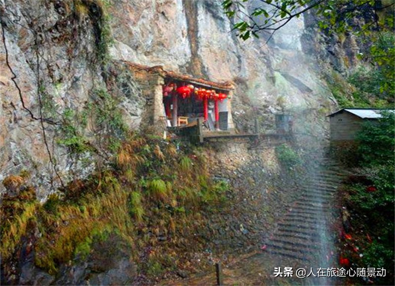 有一条青石板小路通往山顶,阴雨天能看到瀑布飞泻直下,形成水帘似的悬瀑,抛洒到路面上,游人上山必须从瀑布底下穿过,附近有一个小型仙姑庙,说它是庙,仅仅是一座小房子而已,一半露出悬崖,一半缩在一个天然洞穴内。