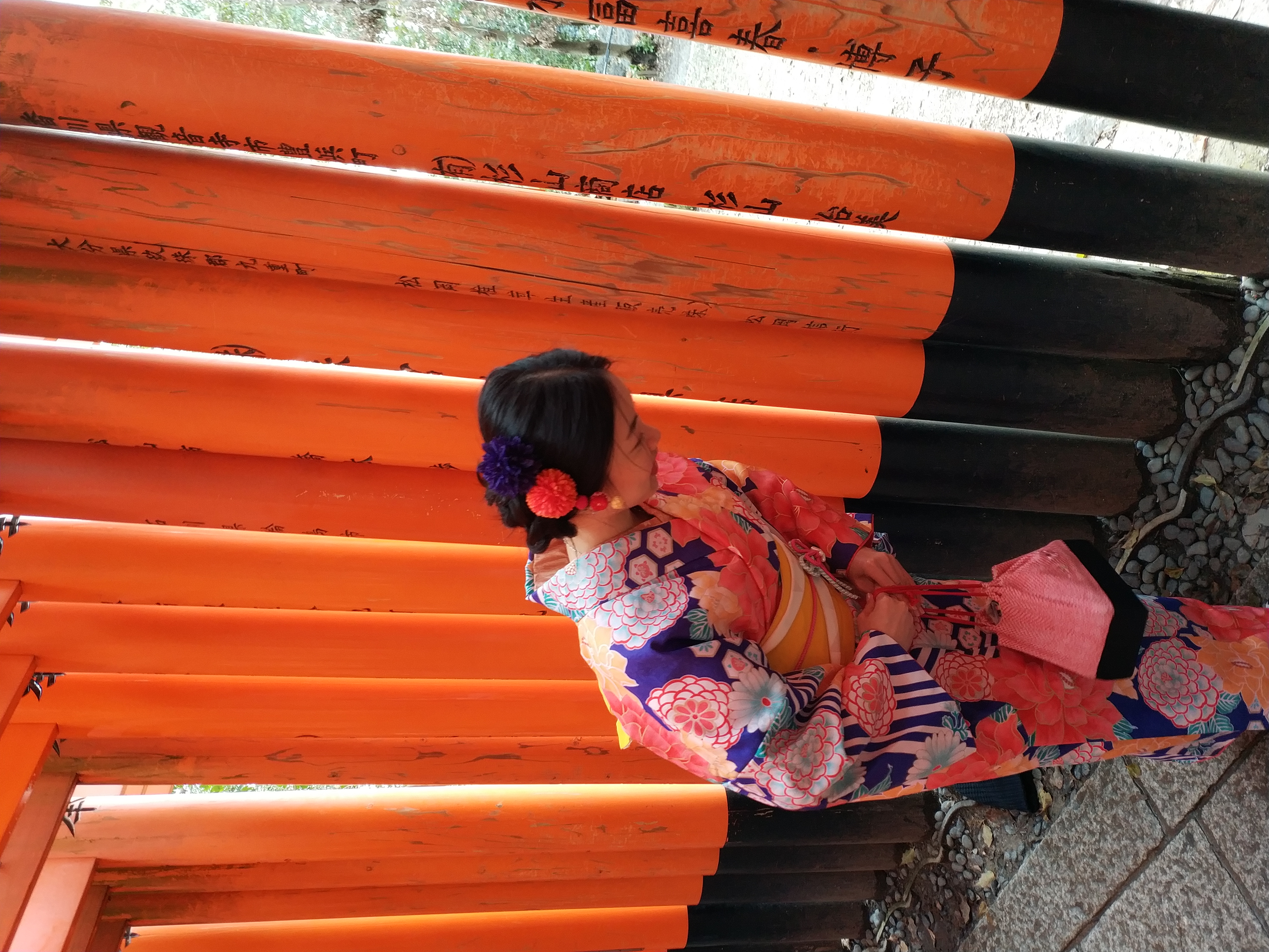 今天早上队伍分成两组,有两位大美女要去穿和服,另两位小姐姐不想去就在民宿睡懒觉,约好在京都站等,我带着两位大美女去到事先在某宝约好的和服店,本来网上说是有中文服务的,结果是没有的,还有她们的英文也不是很好,后面就尴尬了,只能通过跛脚英语和手势交流,花了一个小时才打扮好,接着就去京都站汇合,在那里吃了一个简单的午饭后出发去网红景点伏见稻荷神社;乘坐107号到伏见稻荷下车,走过去大约5分钟;伏见稻荷大社是稻荷神社的总部,网红景点千鸟本居就在里面