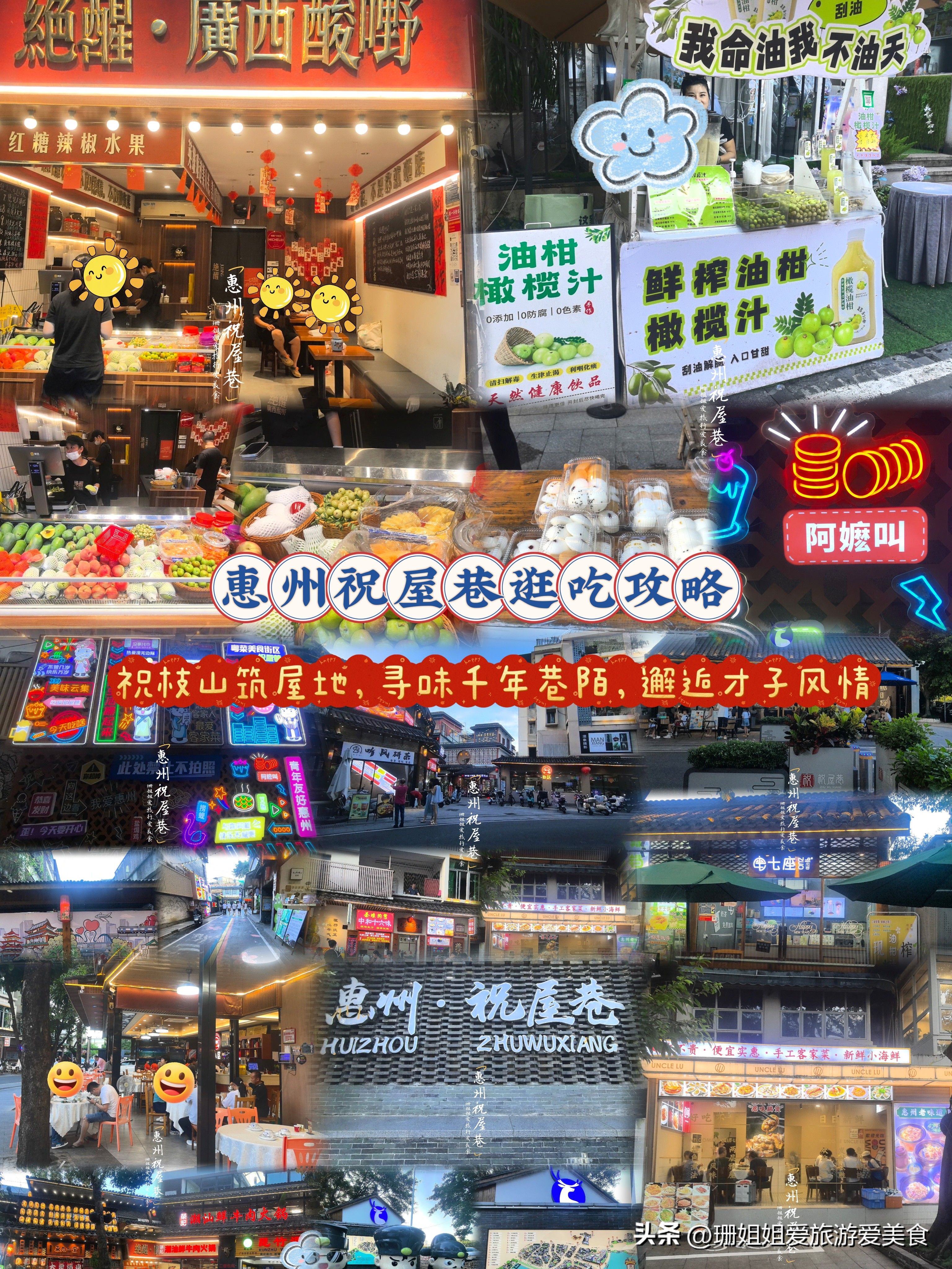 祝屋巷不是单纯的美食街或文创区,而是将500年才子文脉、惠州本土风味与文艺休闲完美融合的街区。在这里,你既能循着历史痕迹感受祝枝山与西湖的故事,也能靠一顿地道客家菜、一份街头小吃填满味蕾,还能打卡墙绘、逛文创店留下纪念。无论是半日闲游还是一日深度逛吃,都能收获“舌尖满足”与“精神愉悦”,非常适合家庭出游、朋友小聚或独自寻觅城市烟火。