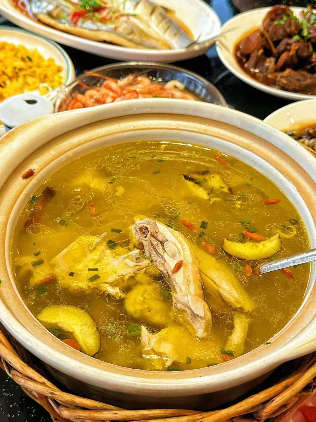 · 草鸡汤炖足六小时,汤面浮着的油珠都是金黄色的