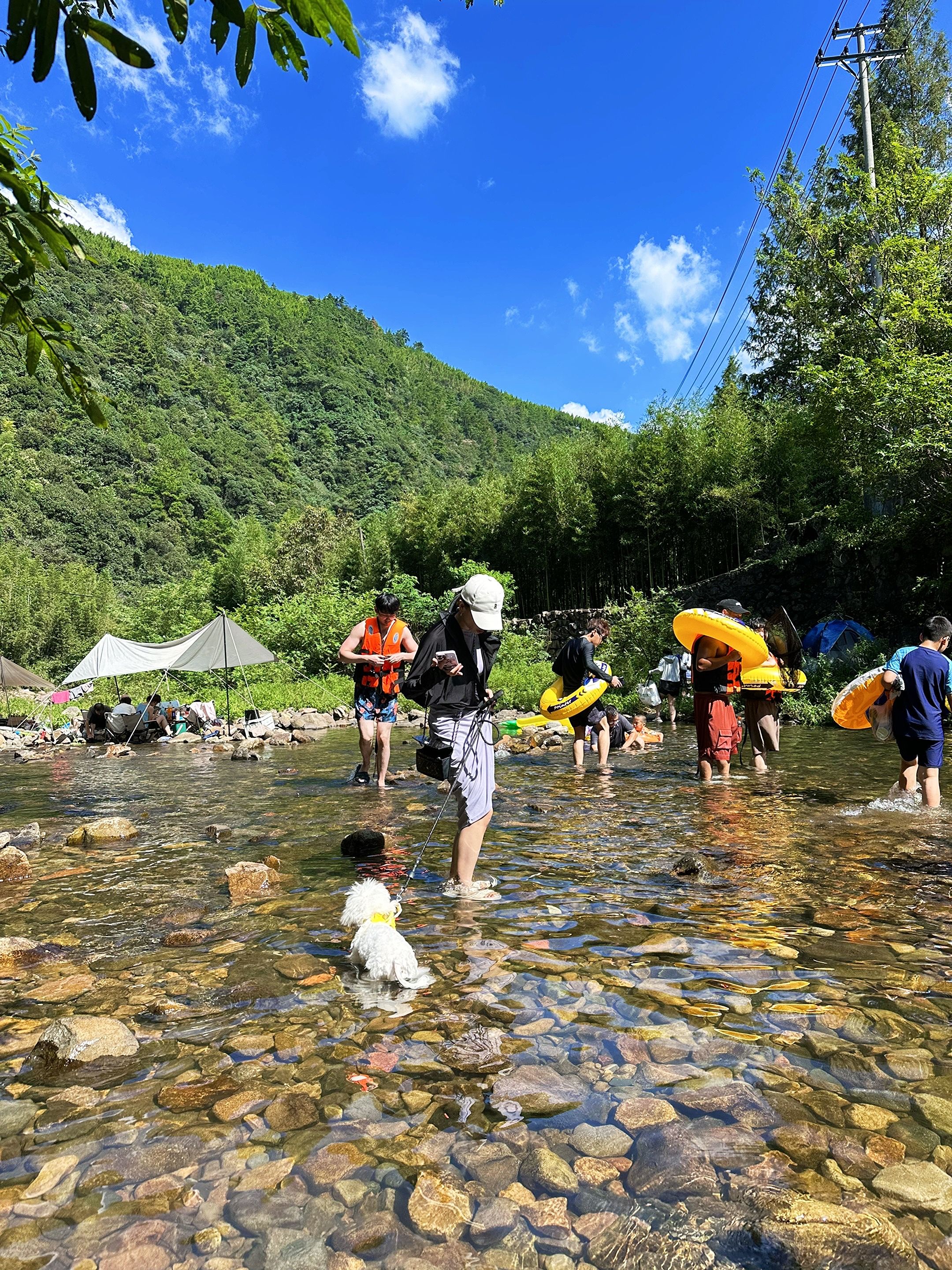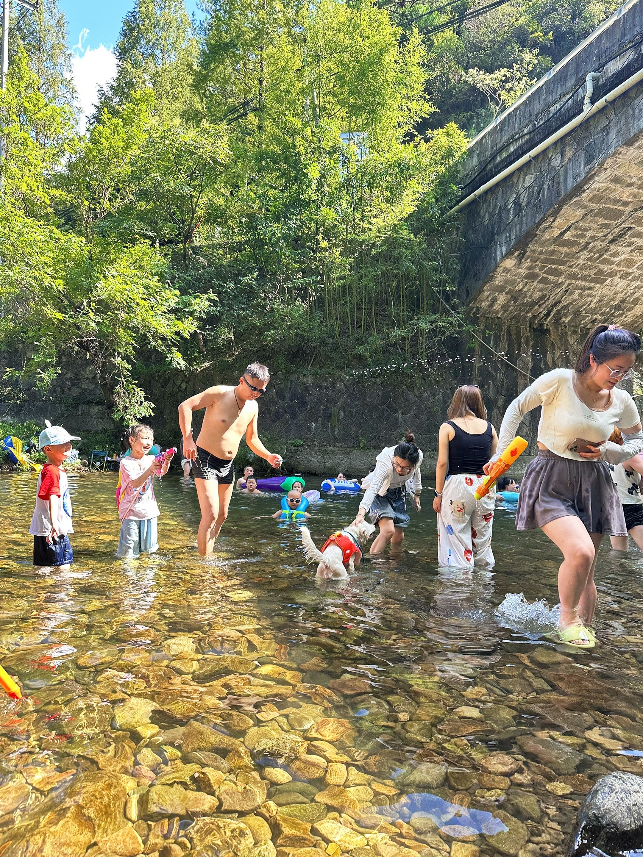 1.5m的潭水清得能看见鹅卵石,会游的直接跳进去扑腾,不会游的套个跟屁虫漂着看云,阳光透过水面照下来,连腿毛都在发光(不是