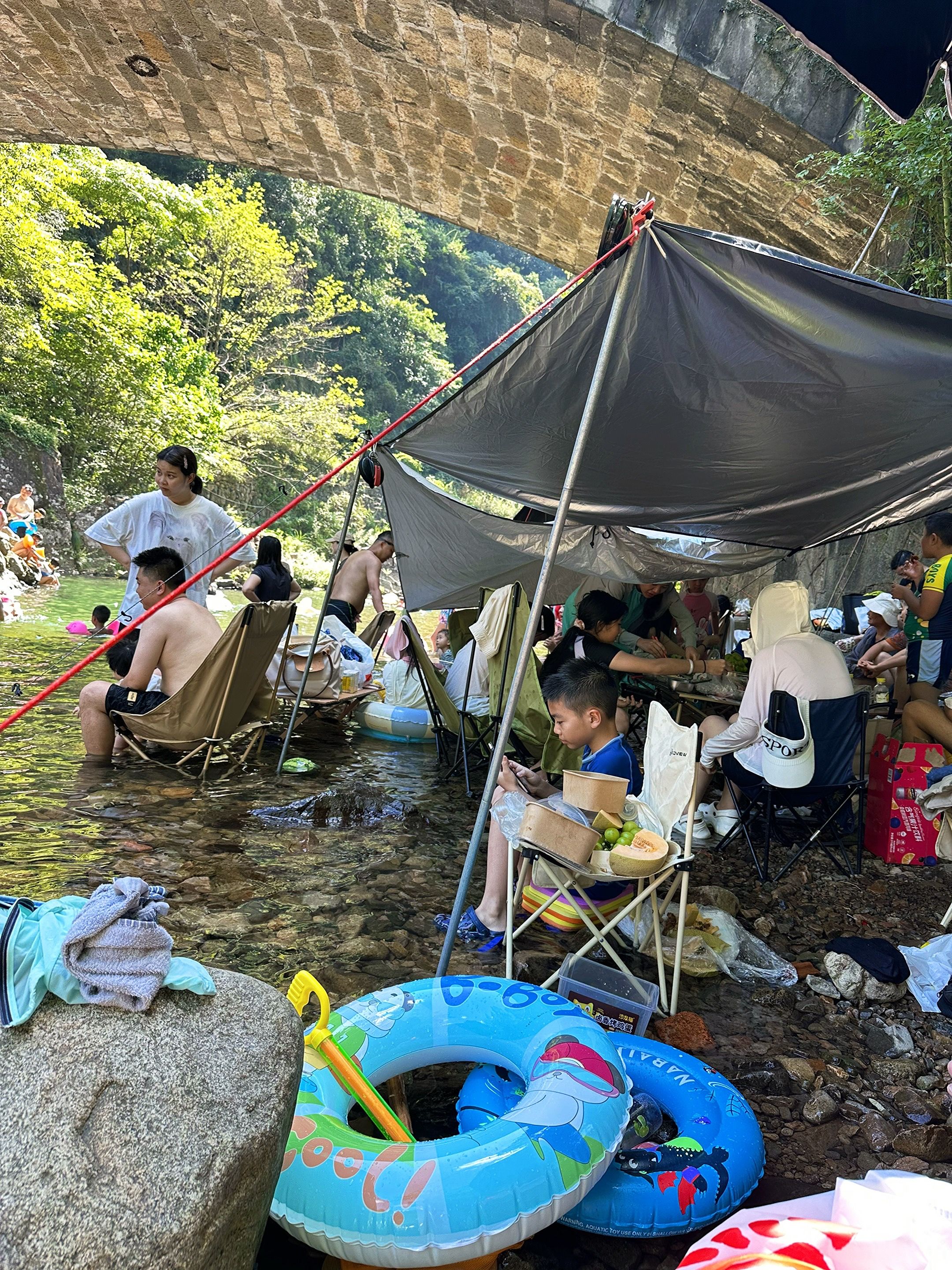 溪边露营才是顶流:停车场步行100米就到水边,搭个天幕,冰西瓜泡在溪水里,烤串的香味混着青草气,冰汽水碰杯时,连蝉鸣都变甜了