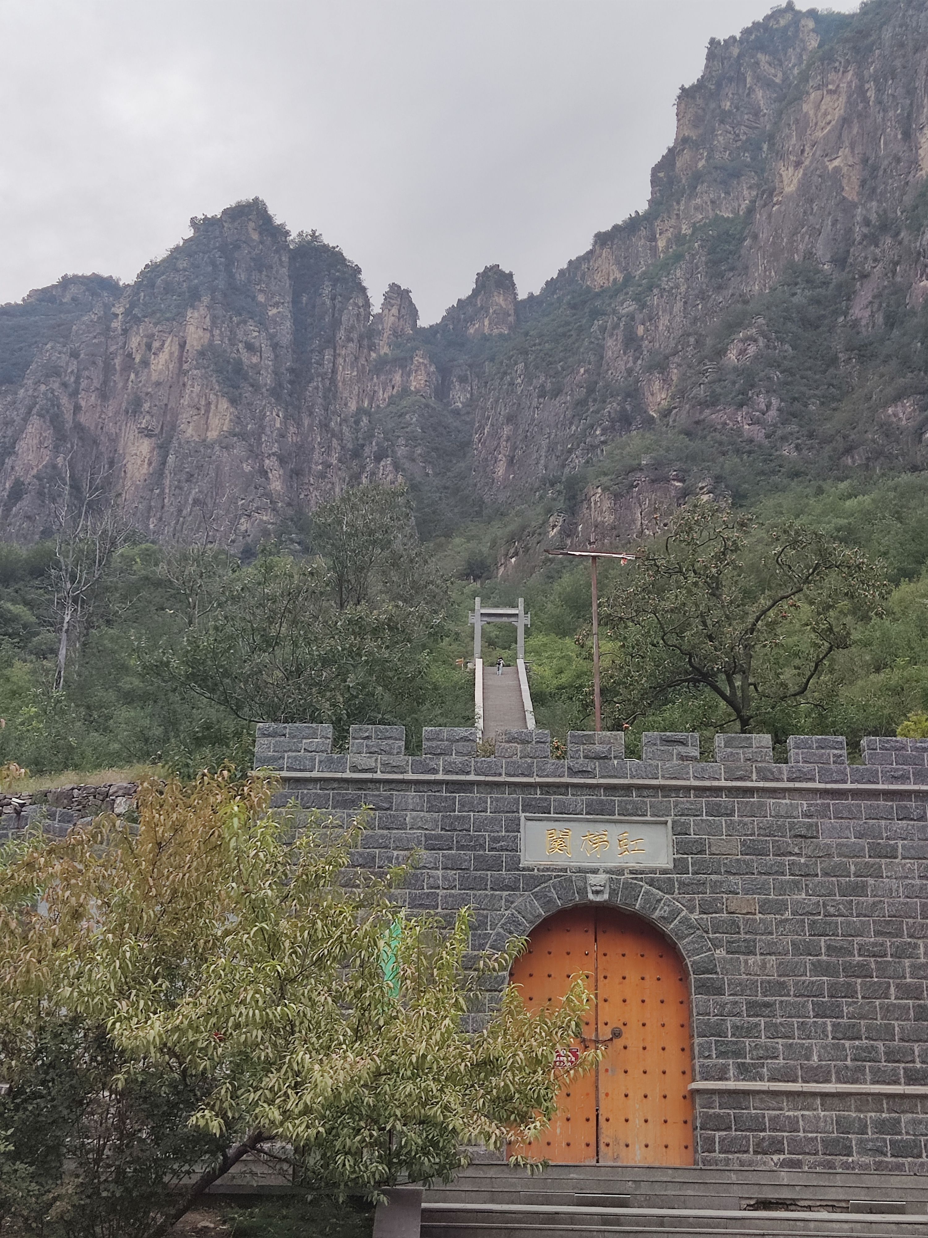 继续上行,穿过几个仅容单车通行还在滴答水的隧洞,曲里拐弯就来到别名风门口的玉峡关城门前,停车后穿过城门后的一线天可以再次居高临下,也可以上楼看层峦叠嶂。