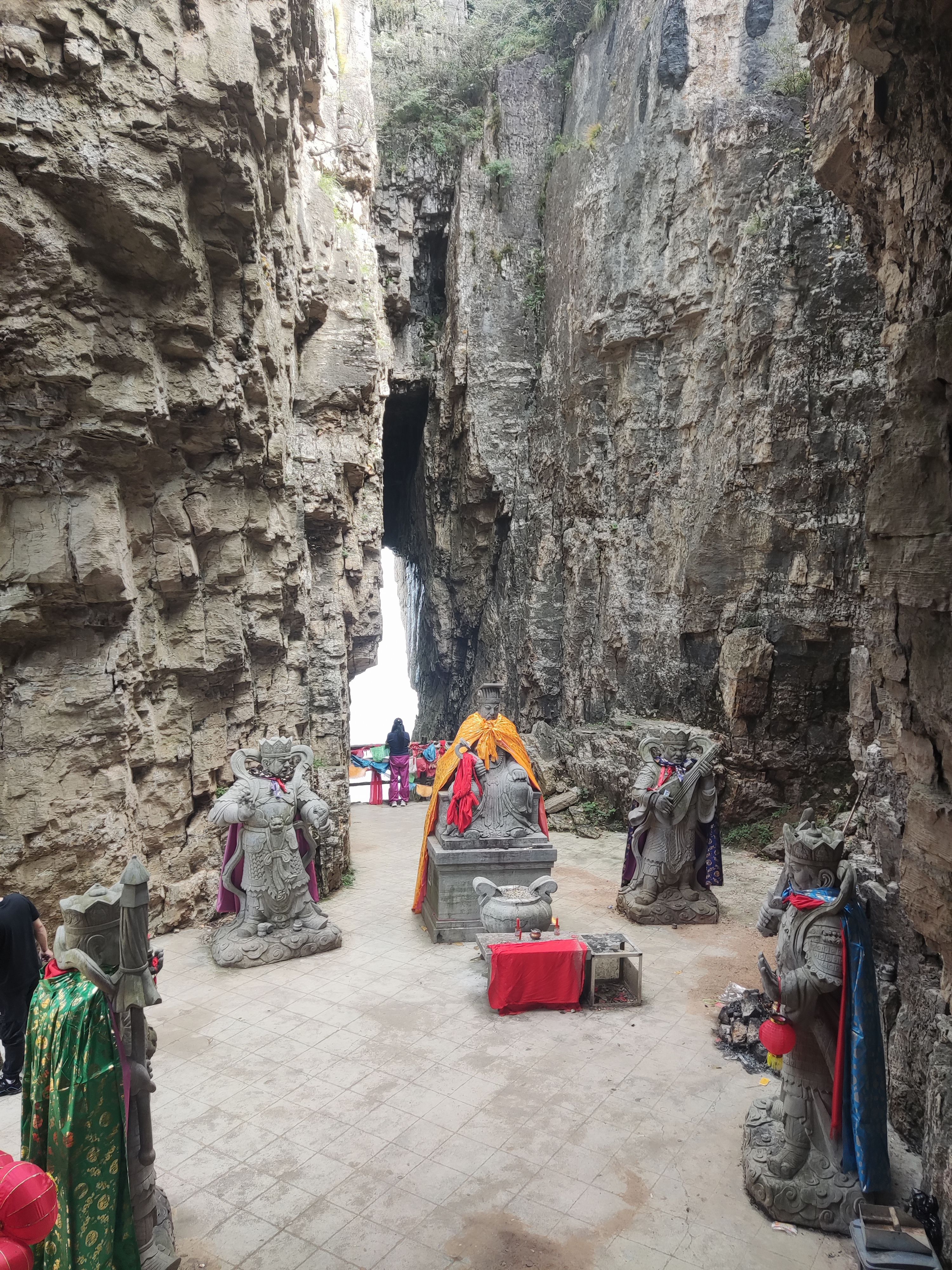 山路弯曲,但感觉不像邢台的蝎子沟与周公山盘山路哪么令人心有恐惧。一路向上来到南天门的岔路口,拐向四公里远的南天门,靠边停车,拾阶而上,峡缝中突现一个大大的洞口,顺阶而下,原来是个天然几十米深百多平米的天井,中央玉帝威坐,两旁有四个天王护驾,威风凛凛。旁还有地藏殿在洞在保佑众生平安,此处可下到洞底参观也可上到洞顶远观或俯视洞底的游客。