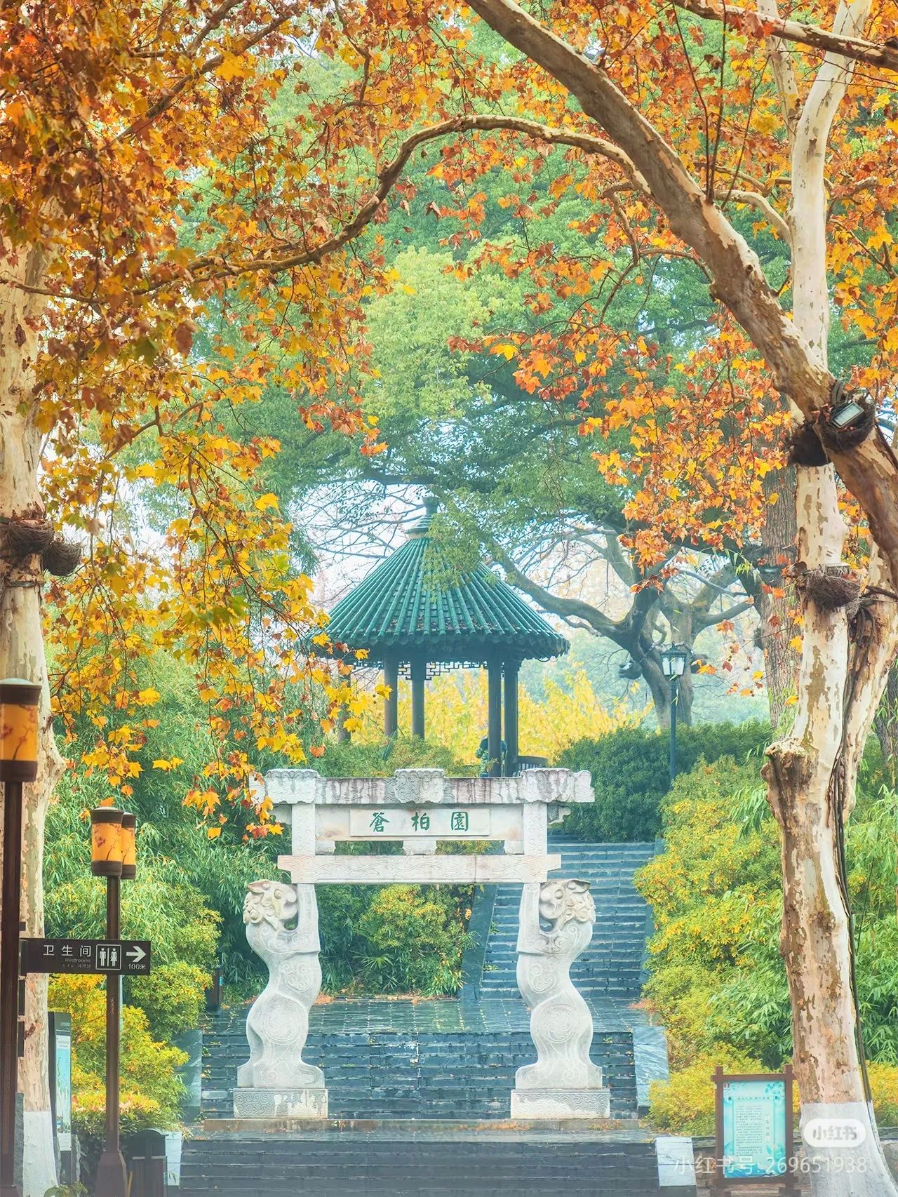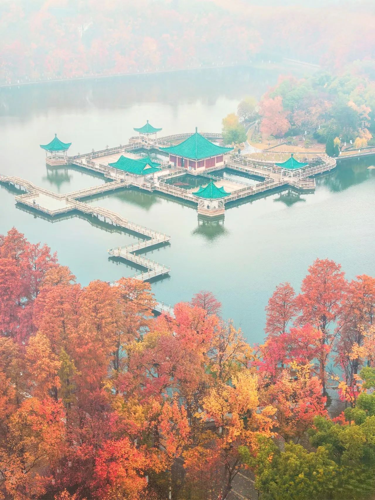 听涛:邂逅诗意秋韵:听涛景区,绝对是东湖春日里最浪漫的存在。这里不仅是观赏日出的绝佳胜地,当细雨纷纷洒落,湖面泛起层层涟漪,整个景区仿佛被蒙上了一层薄纱,如梦如幻。藏在深处的周苍柏纪念馆前,一座亭子在红枫的环绕下,散发着独特的韵味,这不就是武汉版的“爱晚亭”吗?沿着落霞水榭漫步,看湖水波光粼粼;在碧潭观鱼,感受鱼儿的灵动;路过行吟阁、沧浪亭,聆听历史的回响;经过听涛游泳池,回忆那些夏日的欢乐;最后走进苍柏园,感受岁月的沉淀。每一步,都是一次与春日的深情对话。