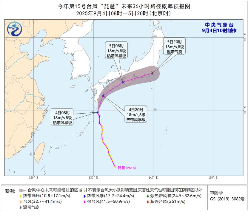 中 央气象台 预计,“琵琶”将以每小时20-25公里的速度向北偏东方向移动,强度变化不大,逐渐趋向日本九州岛南部洋面,4日夜间转向东北方向移动。受其影响,4日白天至夜间,东海东北部偏东海域将有6-8级风,阵风9级。