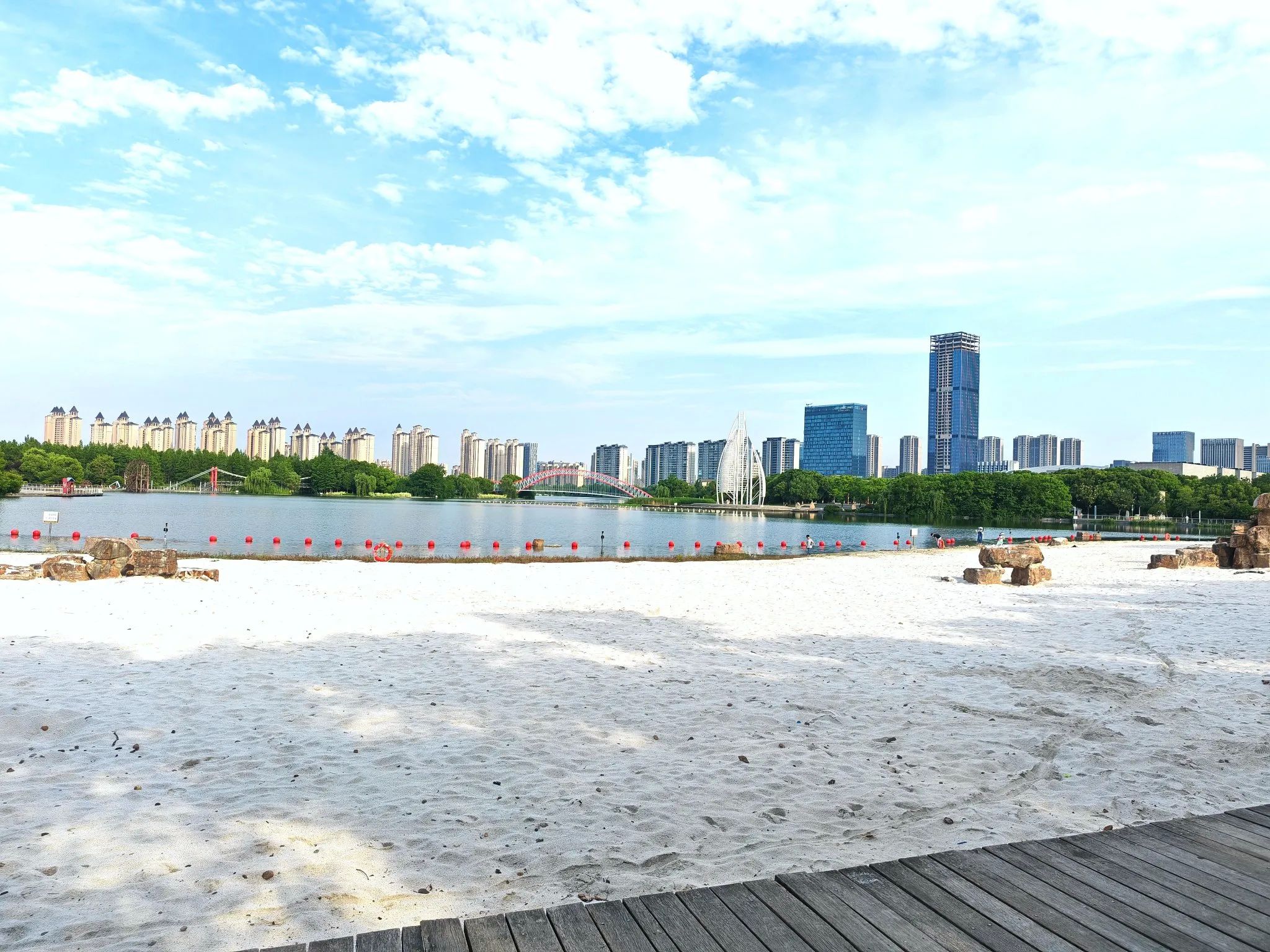 公园围绕“水润龙腾,吴泽苍兴”的主题思想,将“自然、生态、观赏、休闲、健康”的理念融入其中,巧妙融合盛泽地区历史悠久的丝绸文化和桑蚕文化,融入“桑、蚕、丝、织”等丝绸文化符号,设有风帆雕塑、题字景石等,打造成“一环、四区、二十个景点”的都市型生态湿地公园,成为吴江南部新城拓展的一处重要生态休闲之地。其中“一环”指的是长达三公里的环湖自行车道,热爱健身的市民可以租借自行车飞驰在道上,领略全园风光;“四片区”分别为活力都市区、人文风情区、水上活动区、生态涵养区四个片区,而最引人注意的莫属一万多平方米的白色嬉水沙滩和激光音乐喷泉了:细软沙滩适合亲子游玩,被称为“小海边”;大型音乐喷泉定时开放,夜晚桥梁灯光绚丽,呈现现代都市氛围。