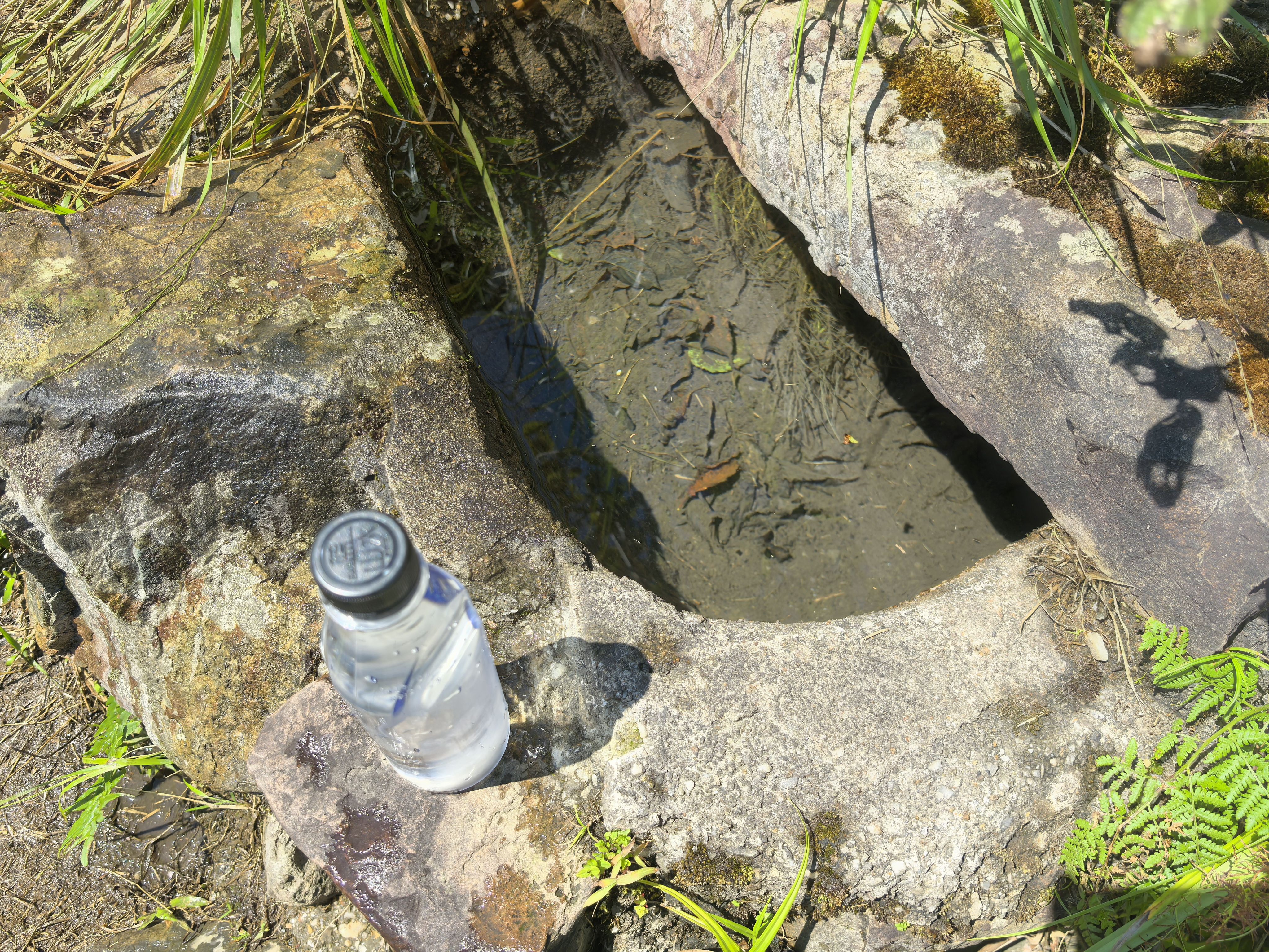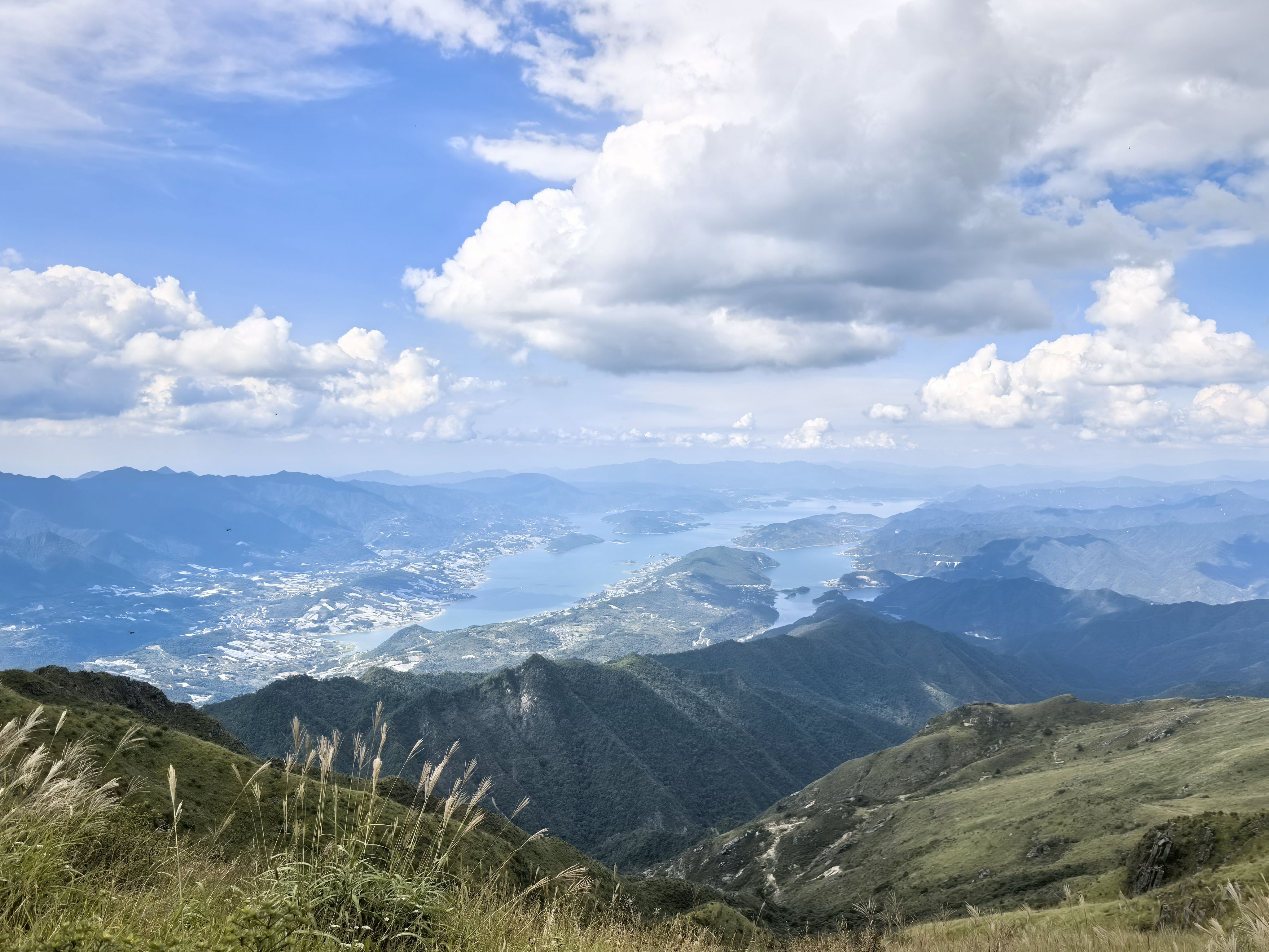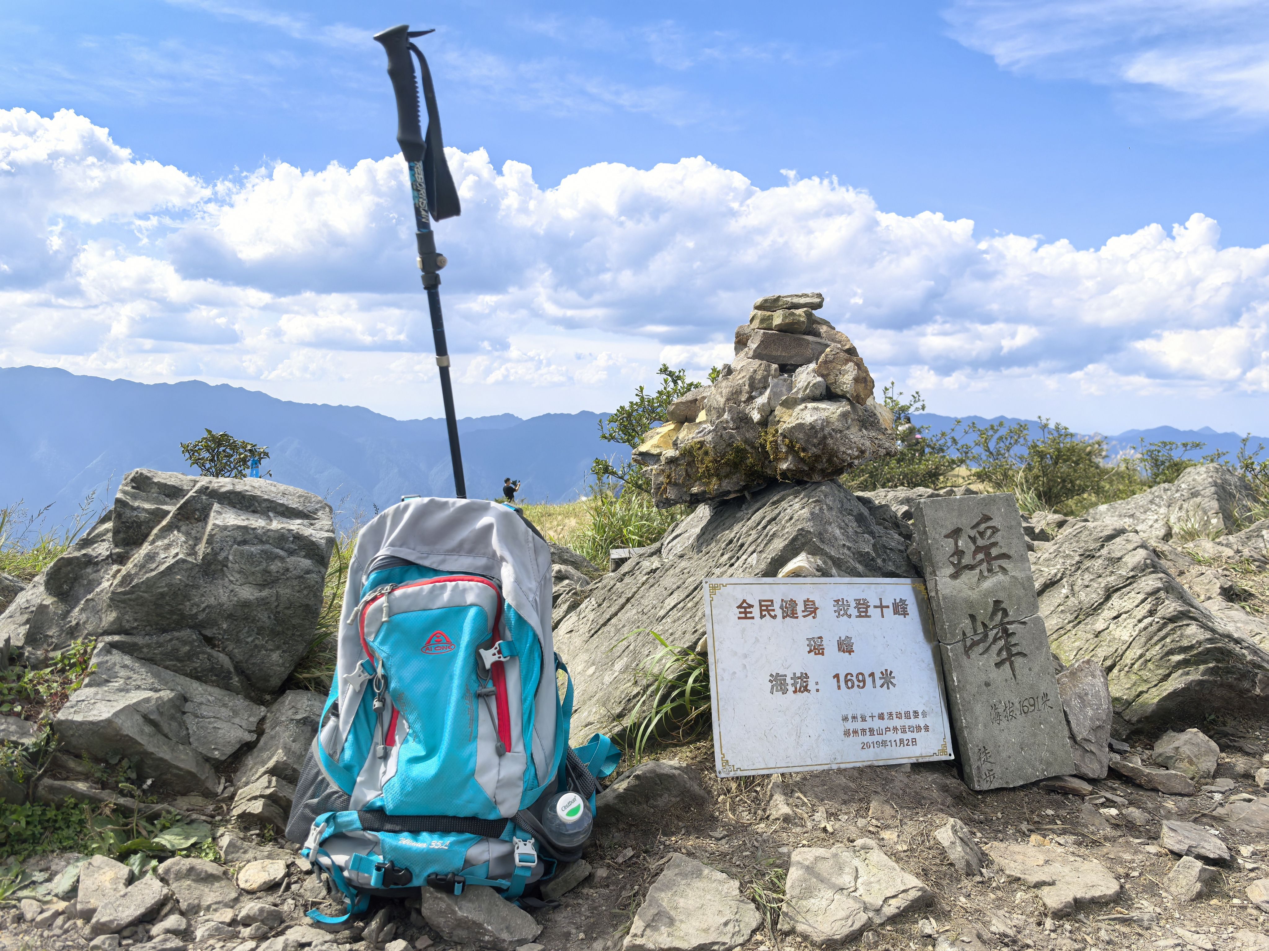 瑶峰山位于矿区,经过废弃矿区,看到废弃的水管、铁丝和装备,还有彩色石头,能感受到岁月的沧桑。都说有山就有水,在这高山上竟邂逅一汪清泉,清澈见底,这是登山人的甘露,甚至是救命水源。快到主峰时已近2点,我们爬了近4个小时,在太阳当头时开始午餐,酸奶、土豆丝煎饼、卤蛋、水果,也算丰盛。短暂休整后,活力满满地继续向山顶进发。在宽阔的土石山顶,看到低矮的瑶峰界碑,我大喊:“瑶峰,我又来了!”在这里,能体会“山高人为峰”“一览众山小”,能指点江山、激扬文字,还能豪情满怀地吟诵唐诗宋词。站在山顶,能更好地俯瞰东江湖,它如碧绿丝带,蜿蜒于群山之间。我在海拔1691米的瑶峰界碑前拍照,证明自己又征服了瑶峰,这就是我爱爬山的原因——山在那里!